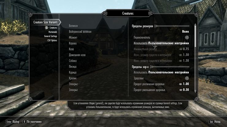 Только существа, использующие ванильные расы (или названные так же, как ванильные), будут ограничены настройками конкретных типов существ. В противном случае существа, раса которых имеет ключевое слово ActorTypeCreature, будут ограничены общими настройками для всех существ. То же самое относится и к NPC - расы с ключевым словом ActorTypeNPC будут ограничены общим лимитом NPC-гуманоидов. Но не забывайте, что Вы можете добавить любую расу NPC или существ в пользовательский набор и задать им определённые пределы изменений.