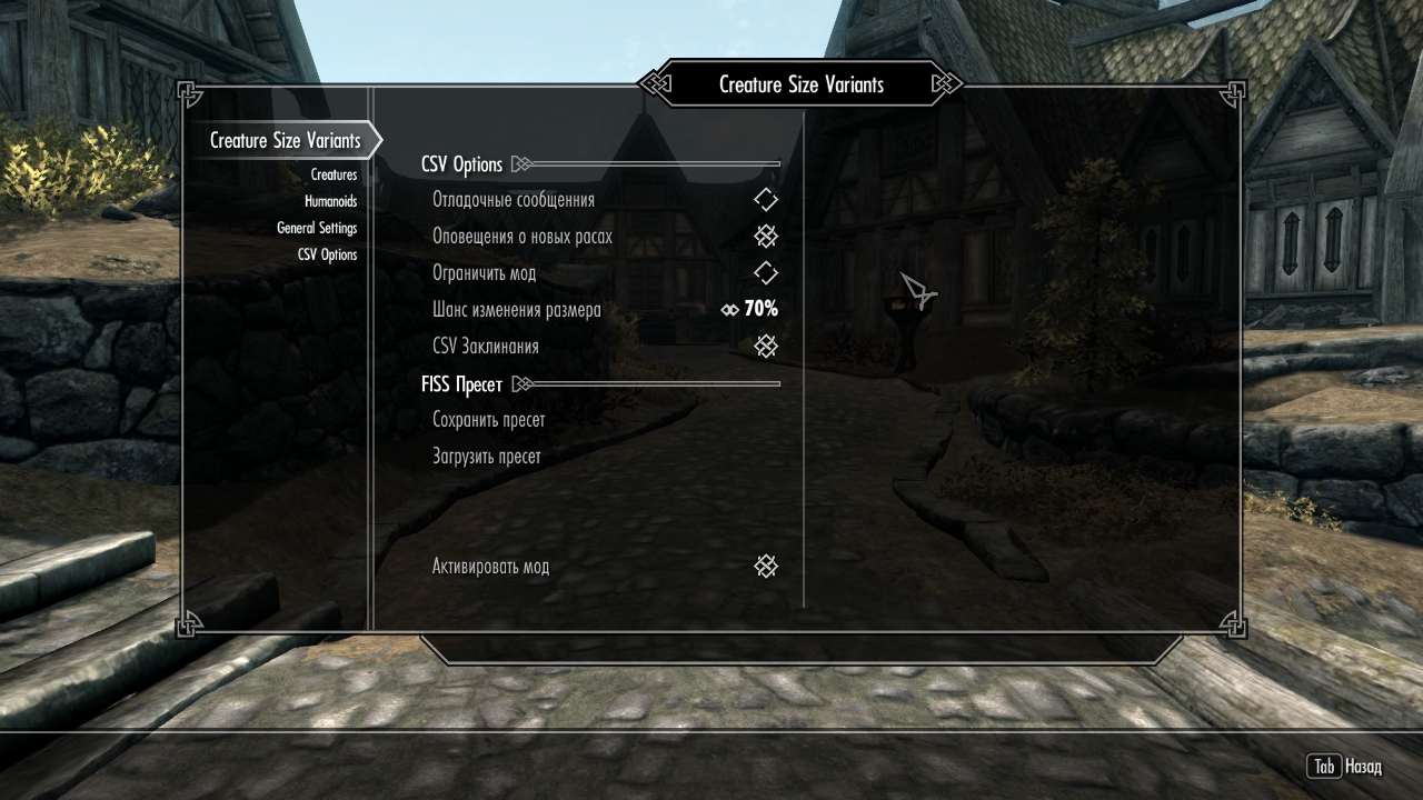 Для совместимости с другими модами, затрагивающими параметр Scale, с версии 1.7 у CSV появилась возможность ограничения действия таким образом, что изменениям размеров будут подлежать только те NPC, что используют оригинальный (ванильный) размер. Таким образом, почти ничего не должно конфликтовать, а если вы знаете, как именно изменяет размер другой возможный мод, то можете настроить CSV для нормальной работы с ним.