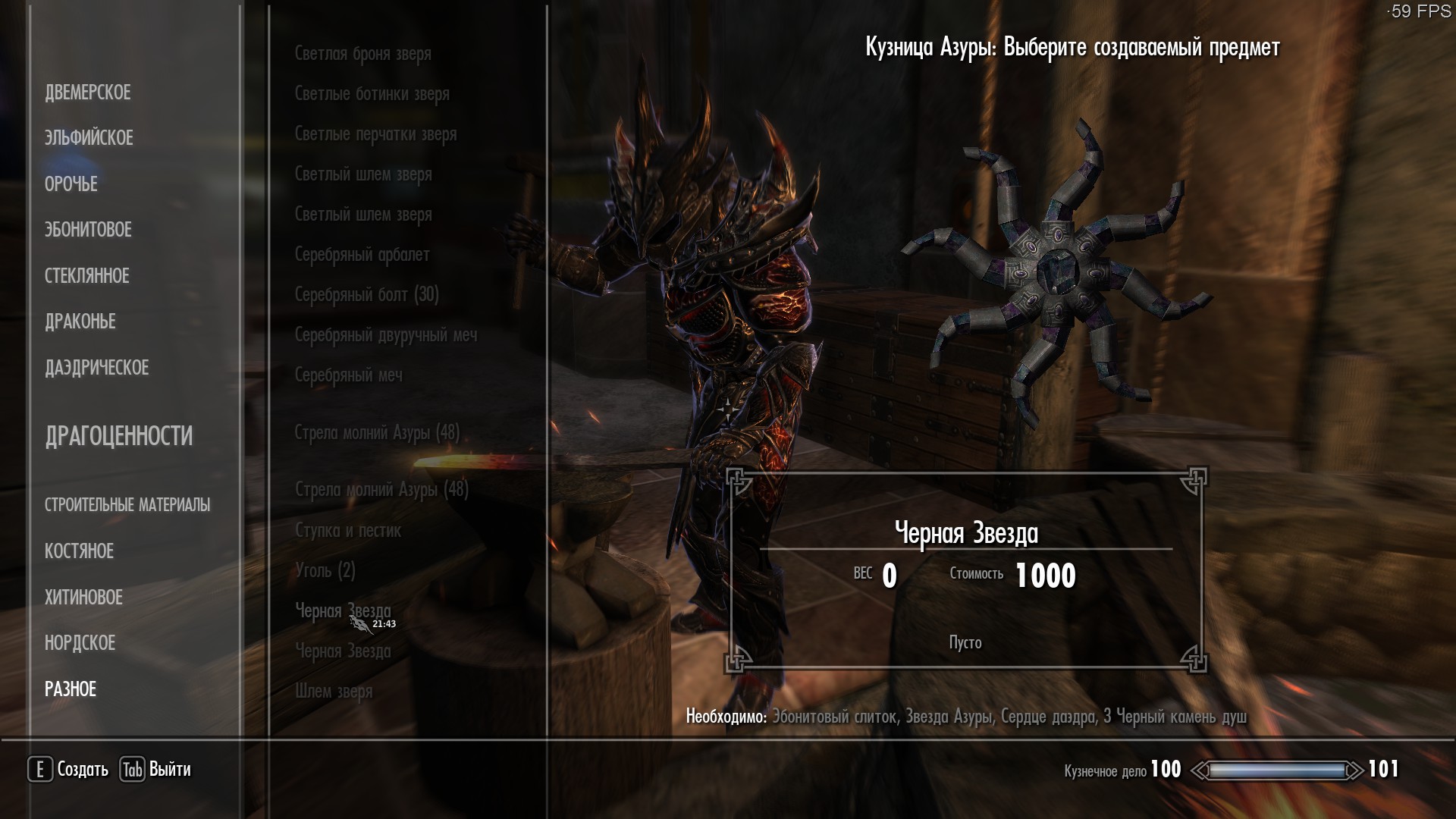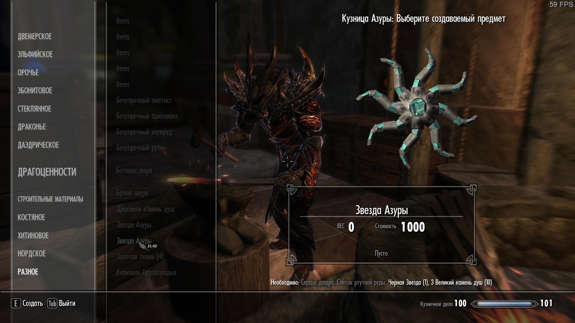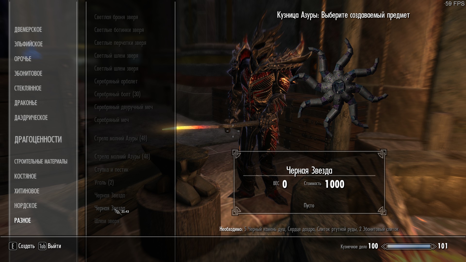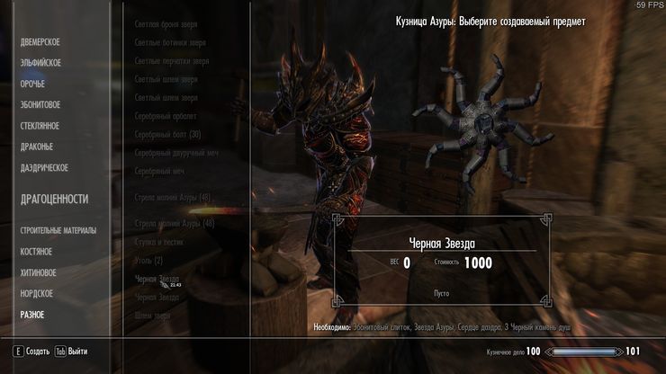 Мод позволит после завершения квеста Азуры крафтить в кузнице(вкладка "Разное") звезду Азуры и Чёрную звезду,