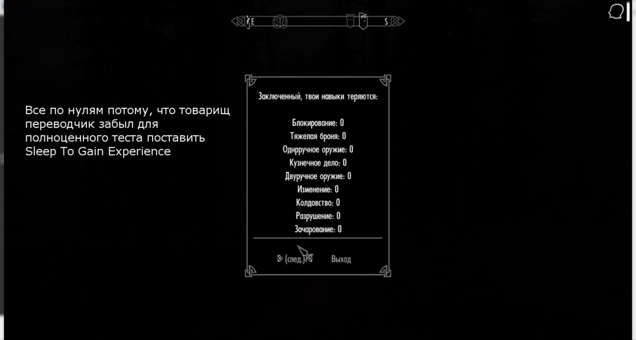 - Вы потеряете драконьи души, опыта, набранный с SXP (Redone) и общий опыт в навыках, если вы используете Sleep To Gain Experience;