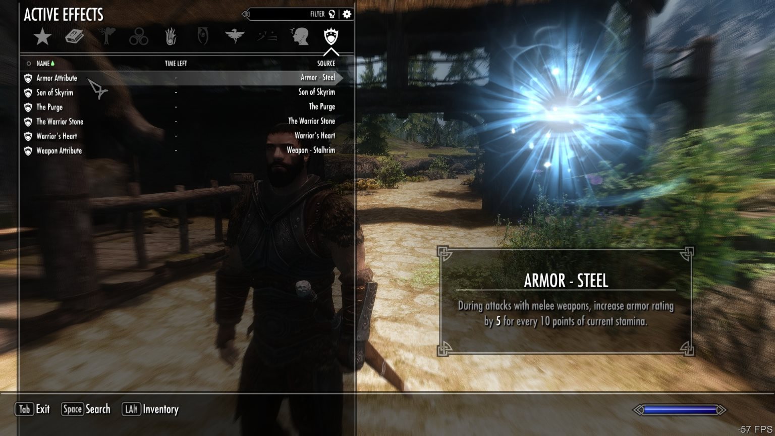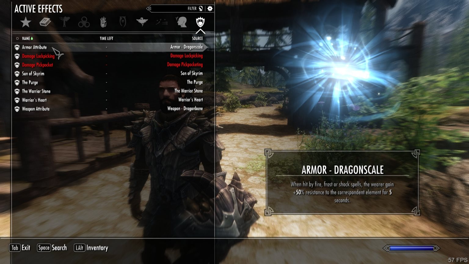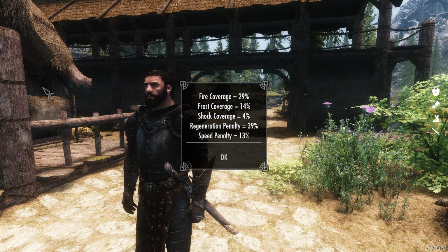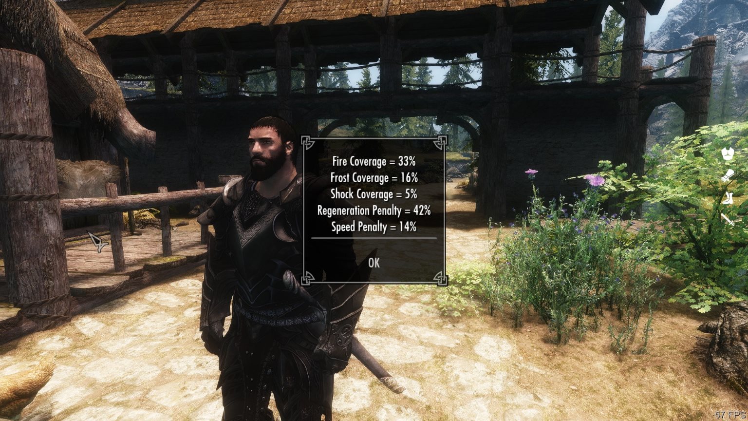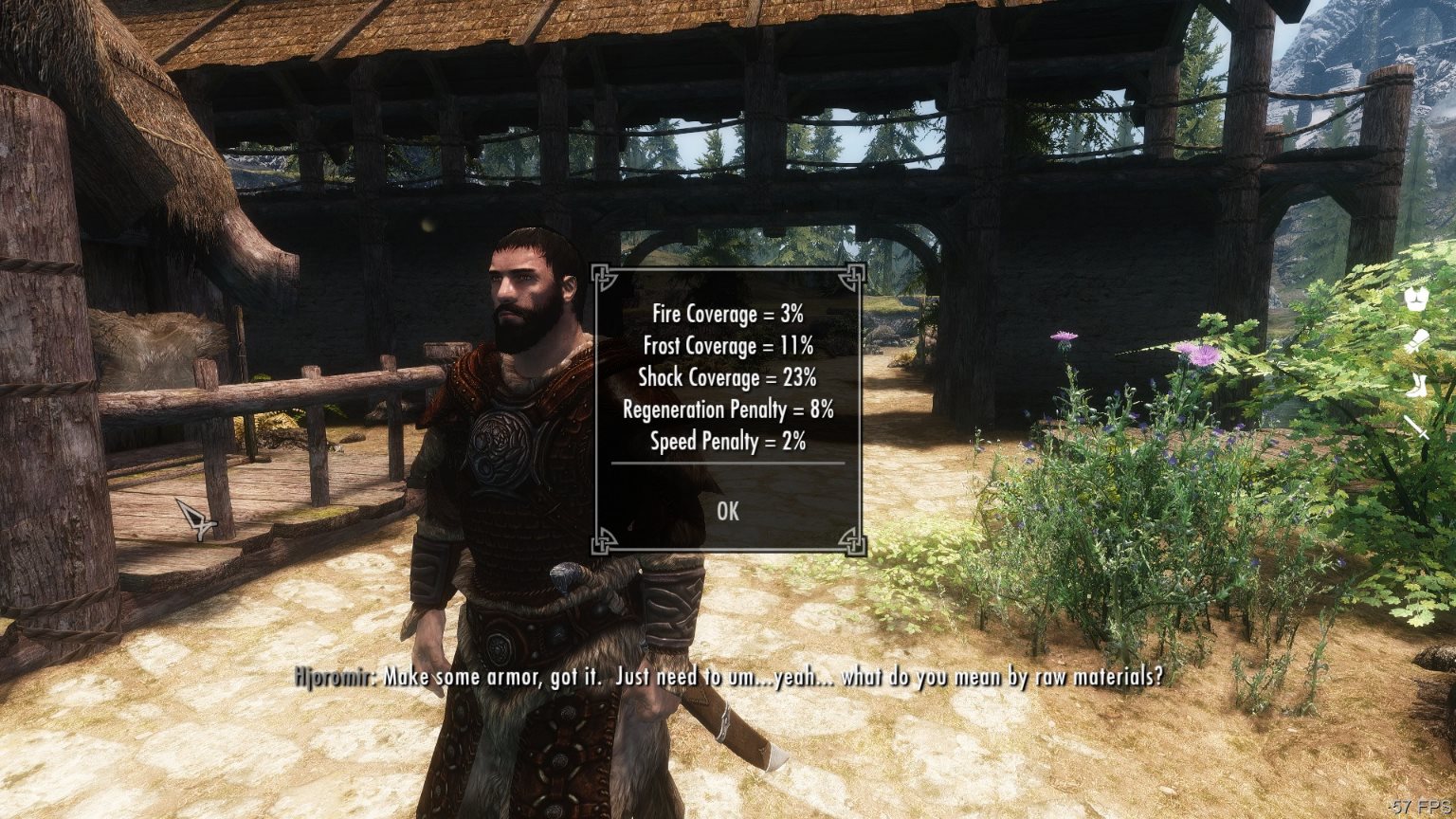 Доспехи станут отличаться не только показателями рейтинга брони, но и защитой от элементального урона, влиянием на скорость восстановления запасов магии и сил, а также на скорость передвижения, исходя из их веса. Каждый доспех заимеет разные величины упомянутых защит, нагрузки на персонажа, это динамически рассчитывается в зависимости от базового рейтинга брони, веса и материала предмета. Также распространяется и на NPC.