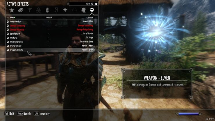 У оружия и доспехов появятся также свойства, зависящие от материалов, имеющие значение и максимально возможный лорный смысл. Например, железо, сталь и кожа - распространенные материалы, простые в использовании, и их свойства направлены на состояние носителя. Орочьи доспехи сделаны из твердых и прочных материалов и их носитель способен ошеломить противника, если тот не заблокировал удар. Двемерские доспехи довольно тяжелые и атакующему придётся изрядно затратить свои силы, чтобы вас поранить, эльфийские имеют некоторые магические свойства и носитель имеет шанс поглотить вражеские заклинания, а носитель даэдрической брони может напустить страх на противника, особенно если действие происходит ночью, и так далее. Полный список ниже.