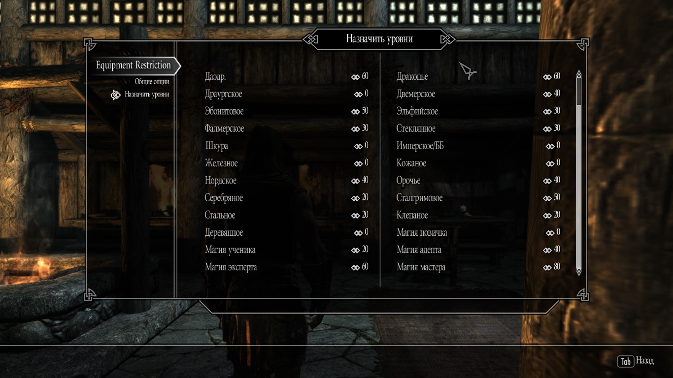 При экипировке оружия, брони или заклинания мод проверяет, соответствует ли персонаж требованиям к навыку. Уровень экипировки определяется её материалом.