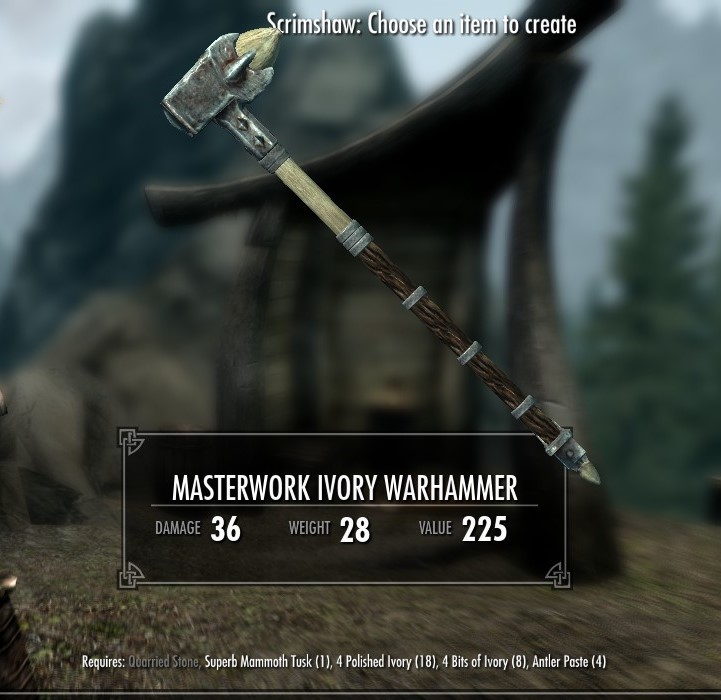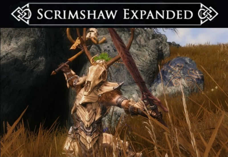 Если вы ответили «Да» на любой из этих вопросов, я хотел бы пригласить вас посмотреть, что может предложить мод Расширенная резьба (Scrimshaw Expanded). Этот мод добавляет к моду Охоторожденный (Hunterborn) множество полезных предметов и раннего оружия, которые помогут вам лучше использовать ресурсы, которые вы найдете, и поможет вашему персонажу, ориентированному на игру охотником, оставаться сильным и стильным в ледяной пустыне Скайрима.