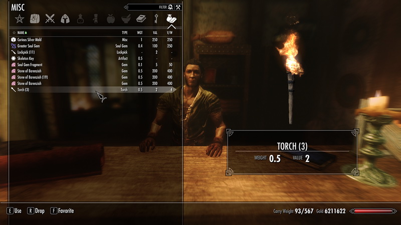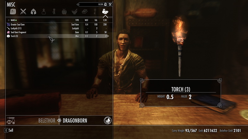 * Однако ошибка или ограничение в Creation Engine не позволяют покупать или продавать факелы. Вы не сможете продавать факелы Белетору или любому торговцу без специального мода.