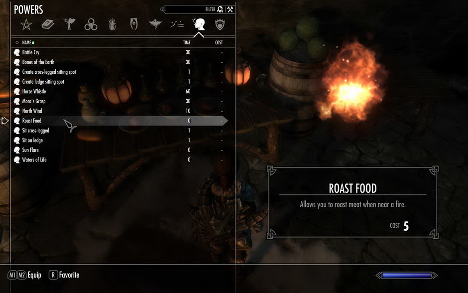 * Как только вы активируете мод, вы получите силу, которую сможете использовать, когда вы стоите рядом с открытым огнем. Если вы его используете, откроется меню, аналогичное меню приготовления пищи, но оно содержит только рецепты пищи, которую можно жарить, например мясо, лук-порей или картофель. (и, возможно, еще немного в будущем)