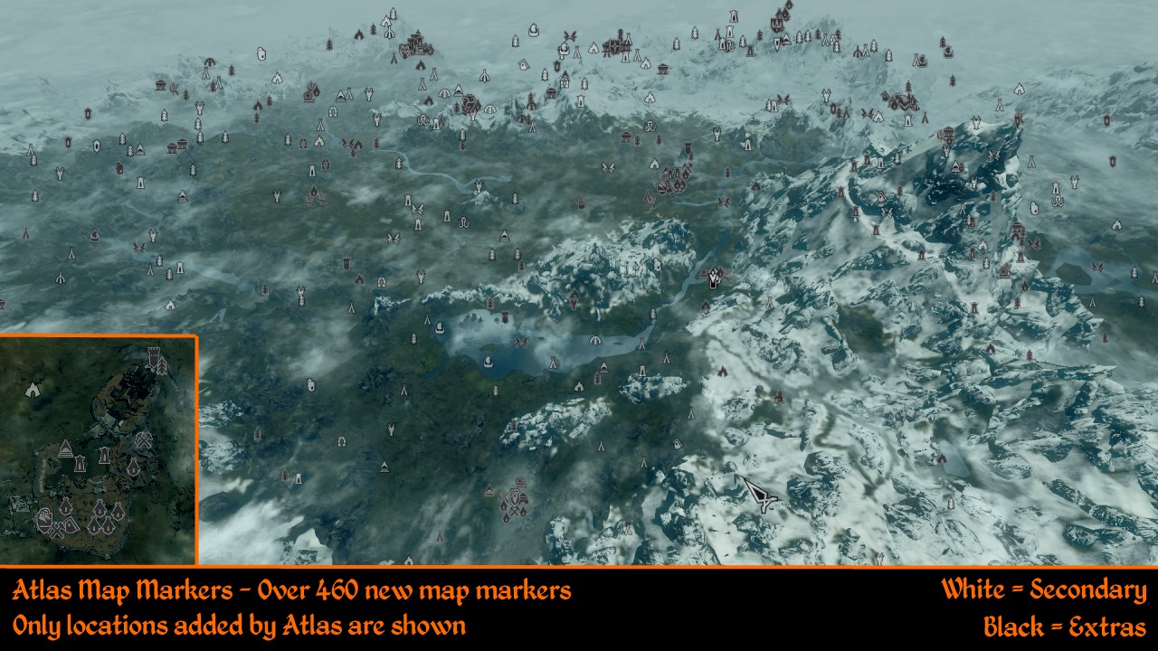 11 Atlas Map Markers - добавлет на карту более 460 отметок имеющихся в Скайриме локаций. Большинство из них могут быть включены/отключены при ппомощи книги настройки в "Ривервудском торговце". Все локации по умолчанию готовы к обнаружению ( за исключением лагерей фракций и карт сокровищ).