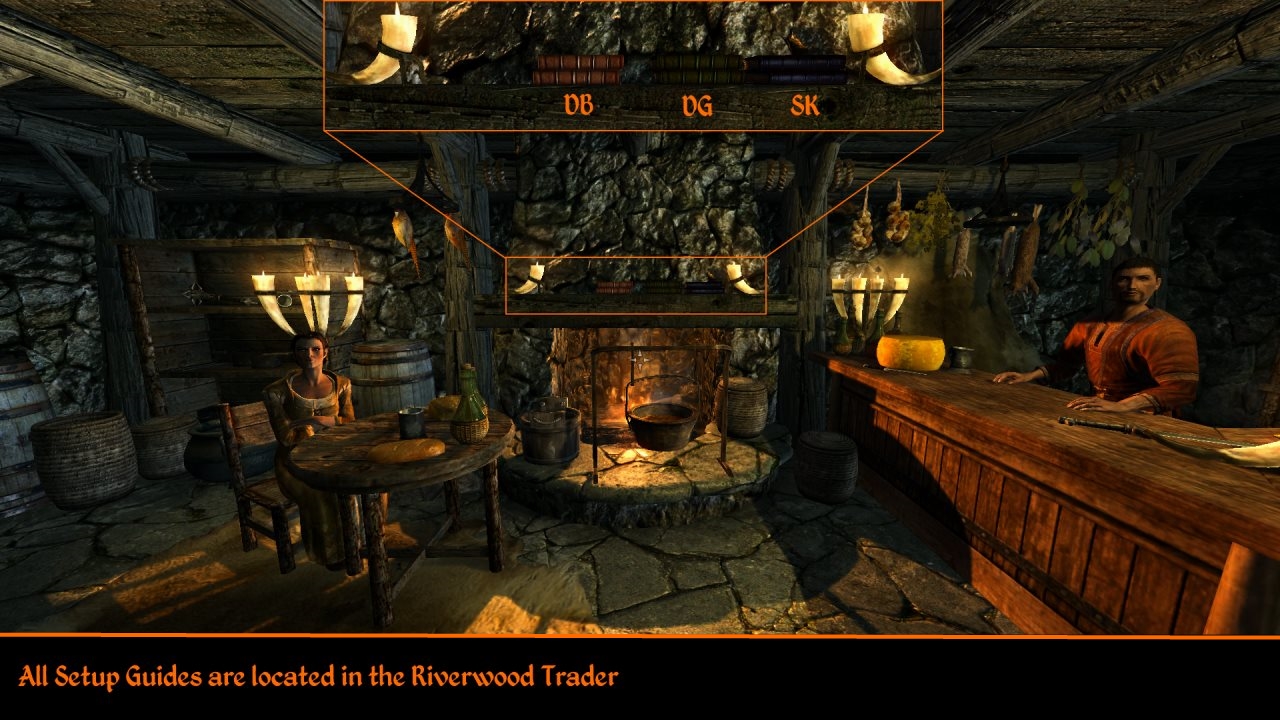 Настроить основной мод и все дополнения вы сможете при помощи специальных книг, расположенных у очага в Ривервудском торговце. Установку см. в ридми.