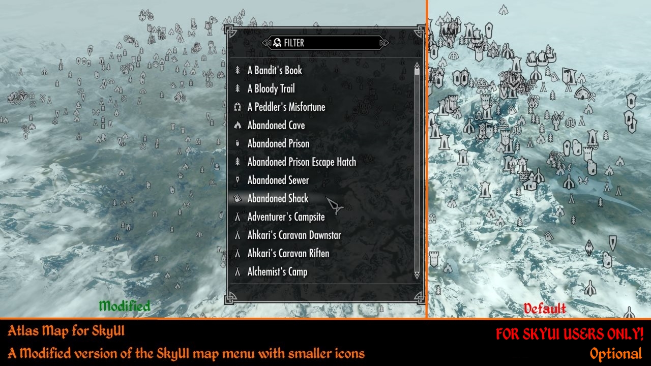 35 Atlas Map for SkyUI - заменяет карту мира модифицироваенной картой SkyUI с уменьшенными иконками. Не совместим с модами, меняющими map.swf. Требует SkyUI!