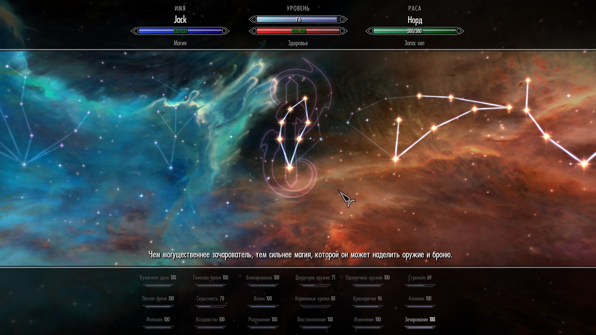 - Во время обзора меню навыков доступен список с названием и прогрессом каждого навыка. Выбранный навык подсвечивается.