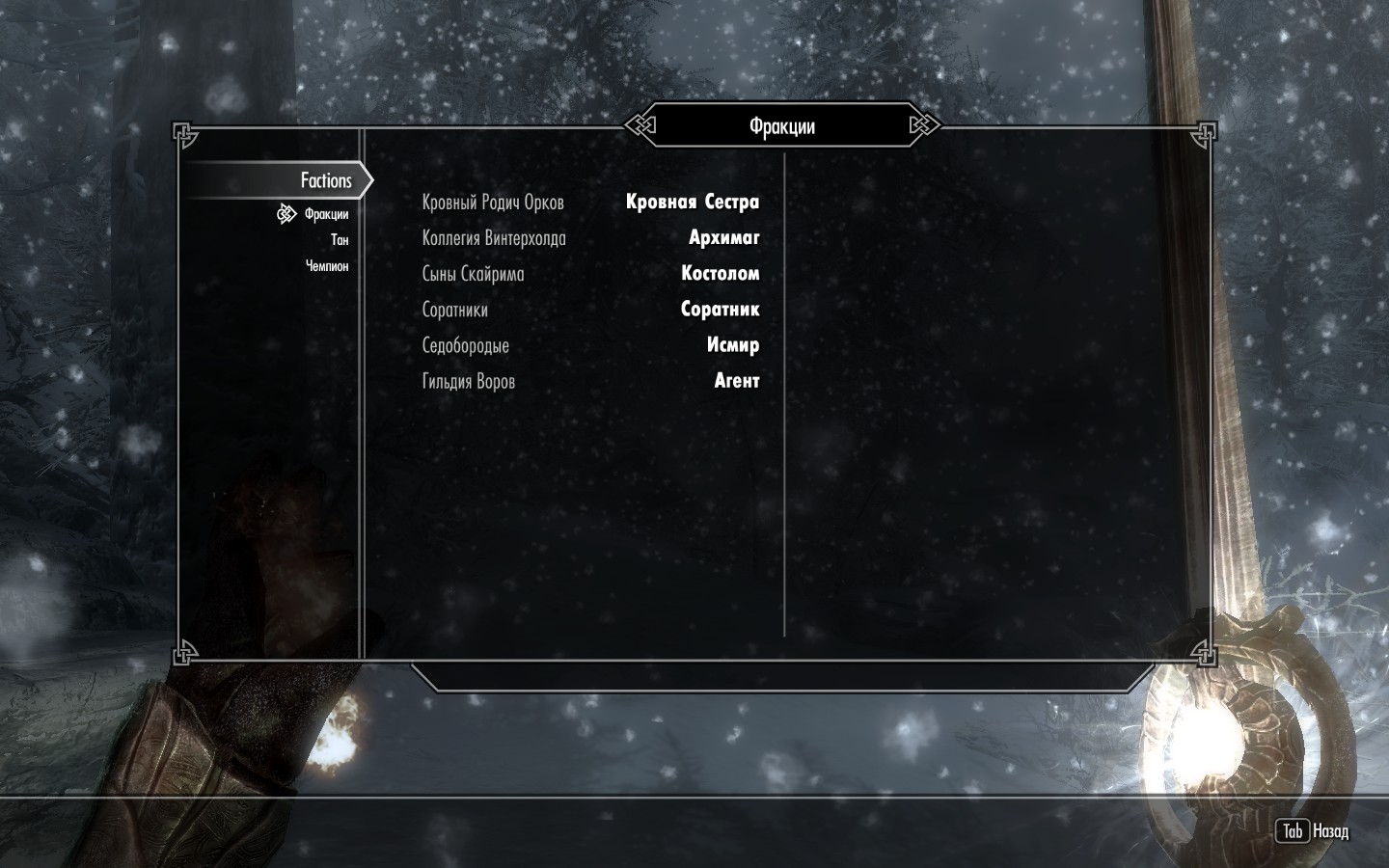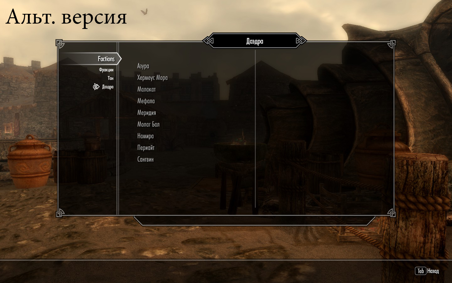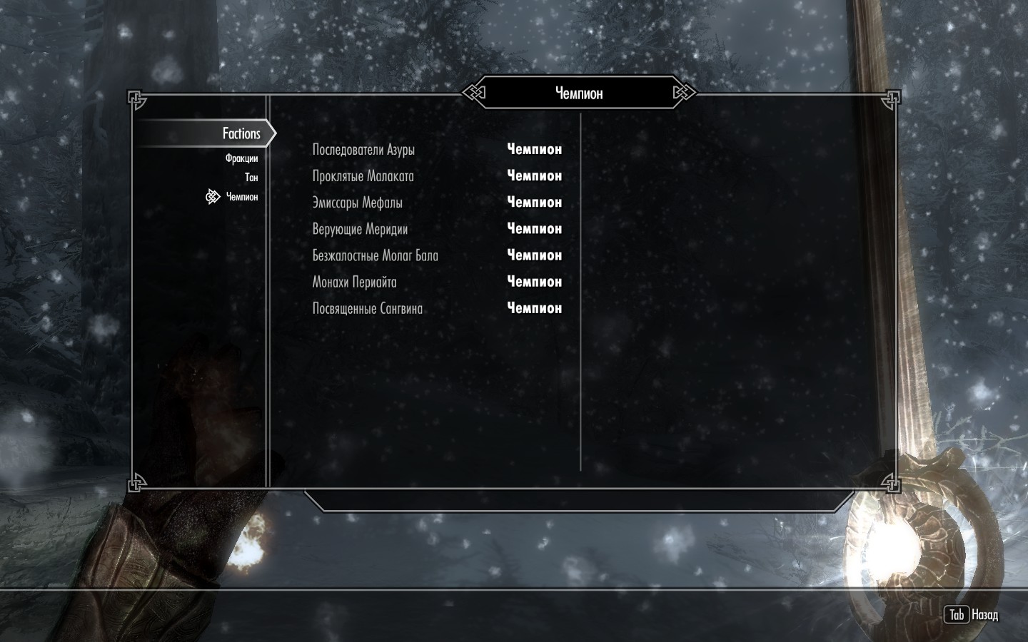 В предыдущих играх серии вы могли видеть, к каким фракциям принадлежит ваш персонаж и каково его звание. В Скайриме эти опции отсутствуют. Данный мод предоставляет возможность увидеть, к какой фракции вы относитесь в данный момент, чемпионом какого принца даэдра и таном какого владения являетесь.