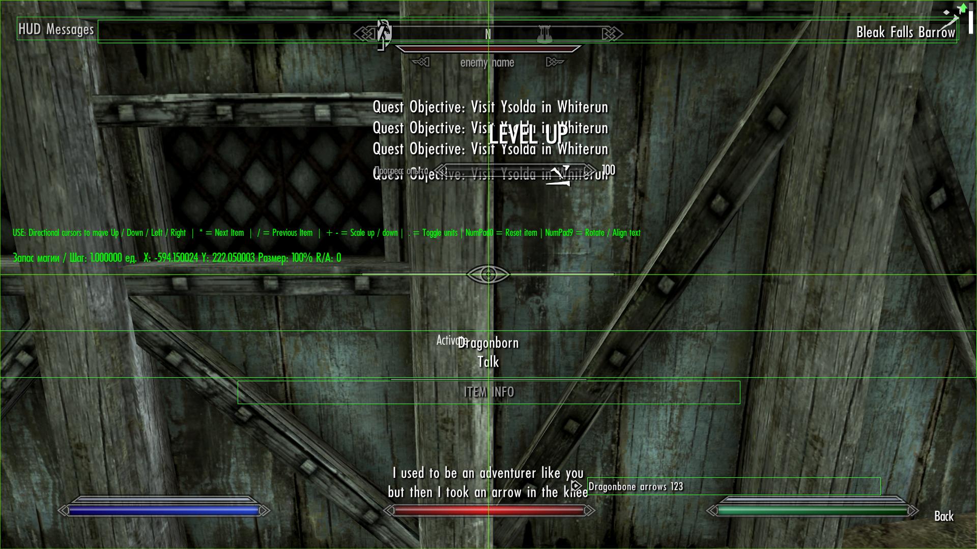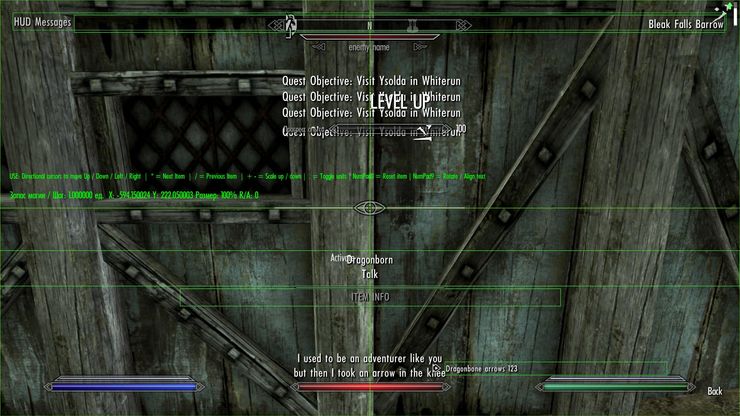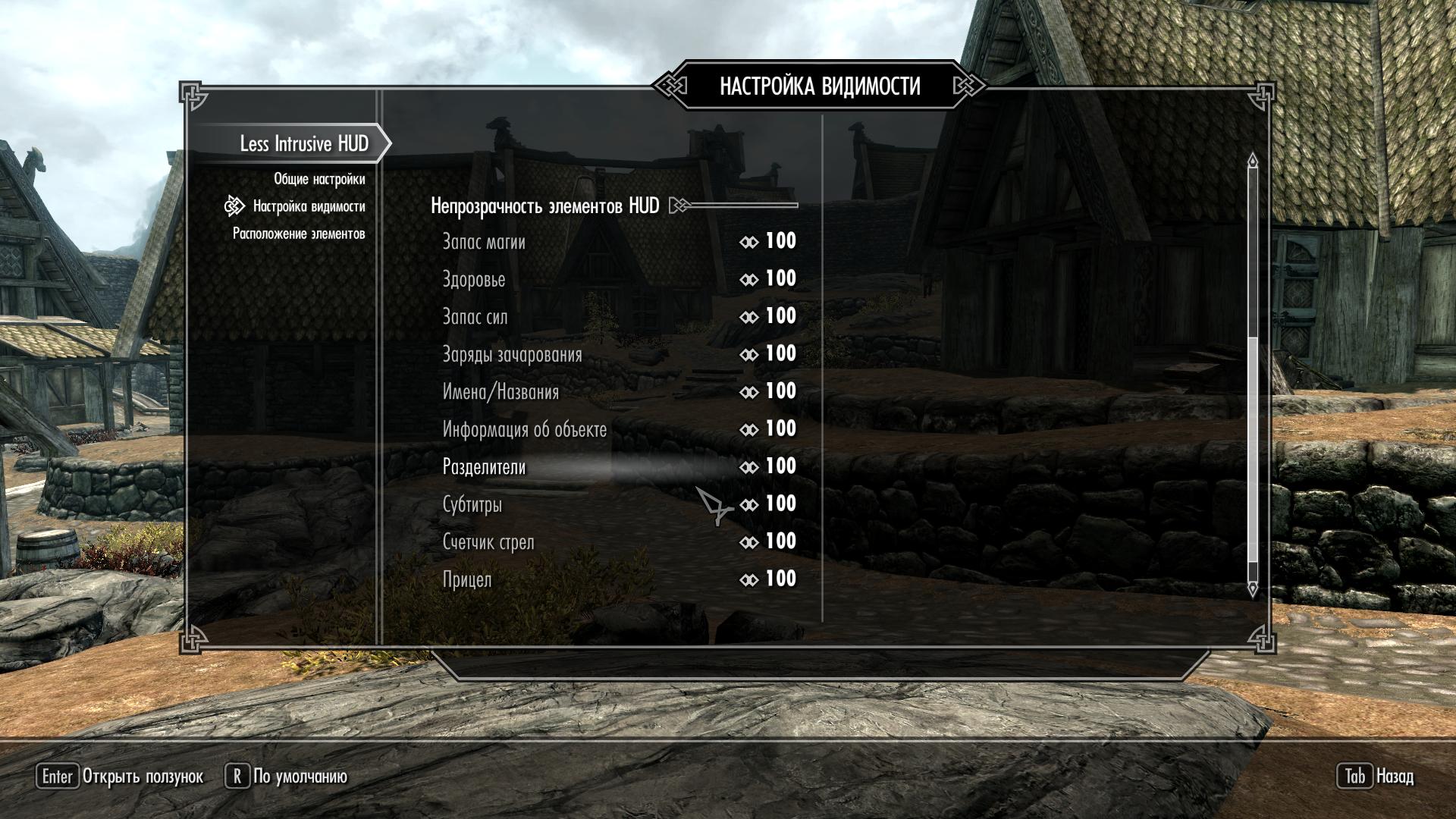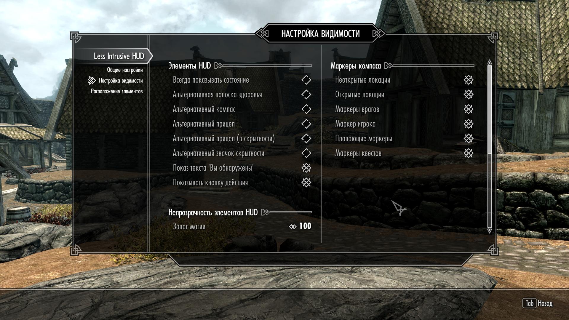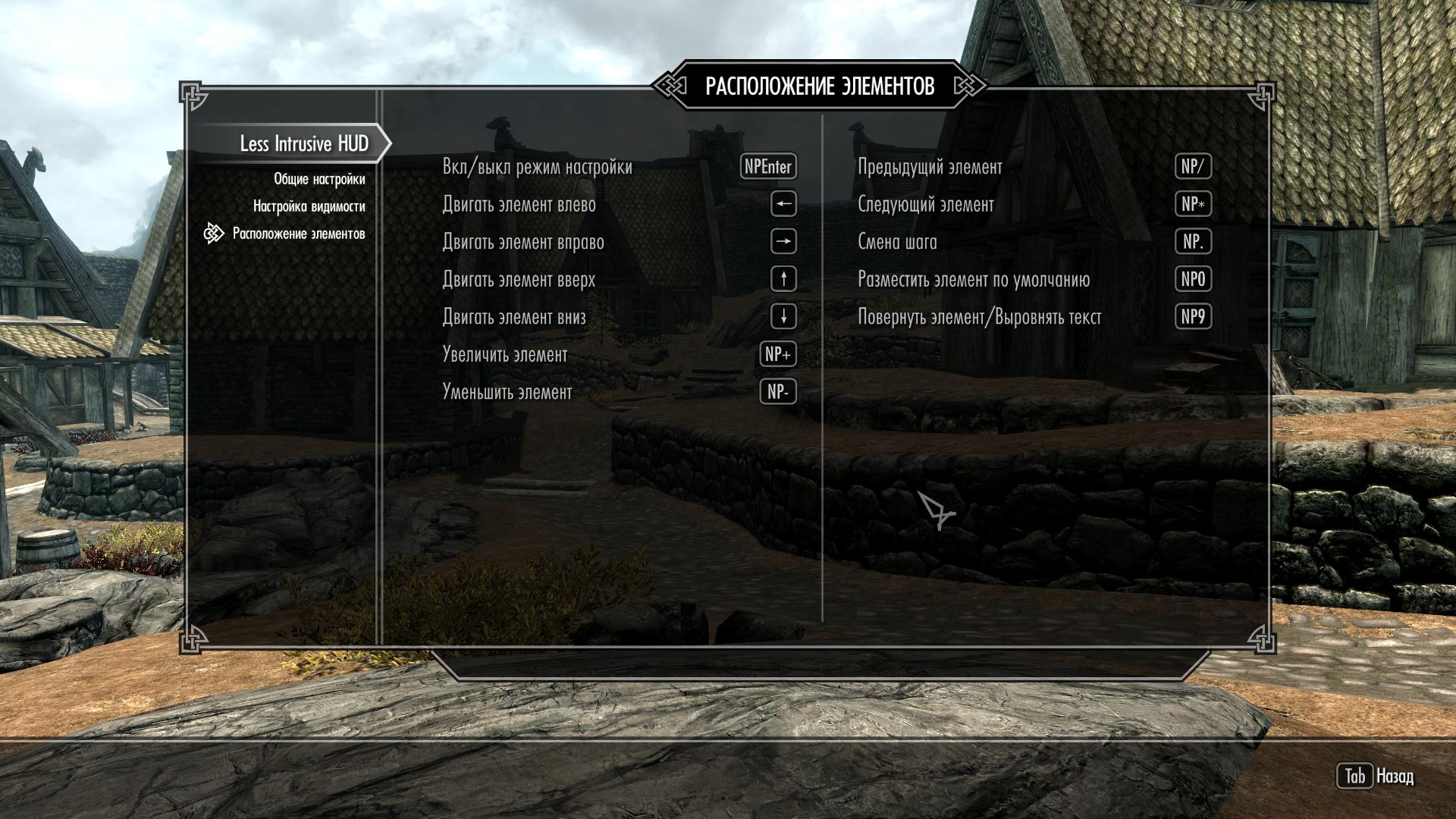 Данный мод позволяет настраивать расположение, размер и угол поворота элементов HUD (Head-Up Display), то есть элементов, видимых на основном "игровом" экране. Хотите сделать вертикальное расположение полосок ХП, маны или стамины? -Нет проблем. Хотите уменьшить их, дабы они занимали меньше места? - Пожалуйста. Передвинуть/изменить размер/повернуть можно любой "ванильный" элемент экрана: полосы ХП/маны/стамины, заряды зачарованного оружия, субтитры, компас, название и кол-во стрел, оповещения в левом верхнем углу экрана, оповещения типа "Выучен новый крик", полоску Вашего прогресса в уровне и умениях - в общем, можно двигать все!!!