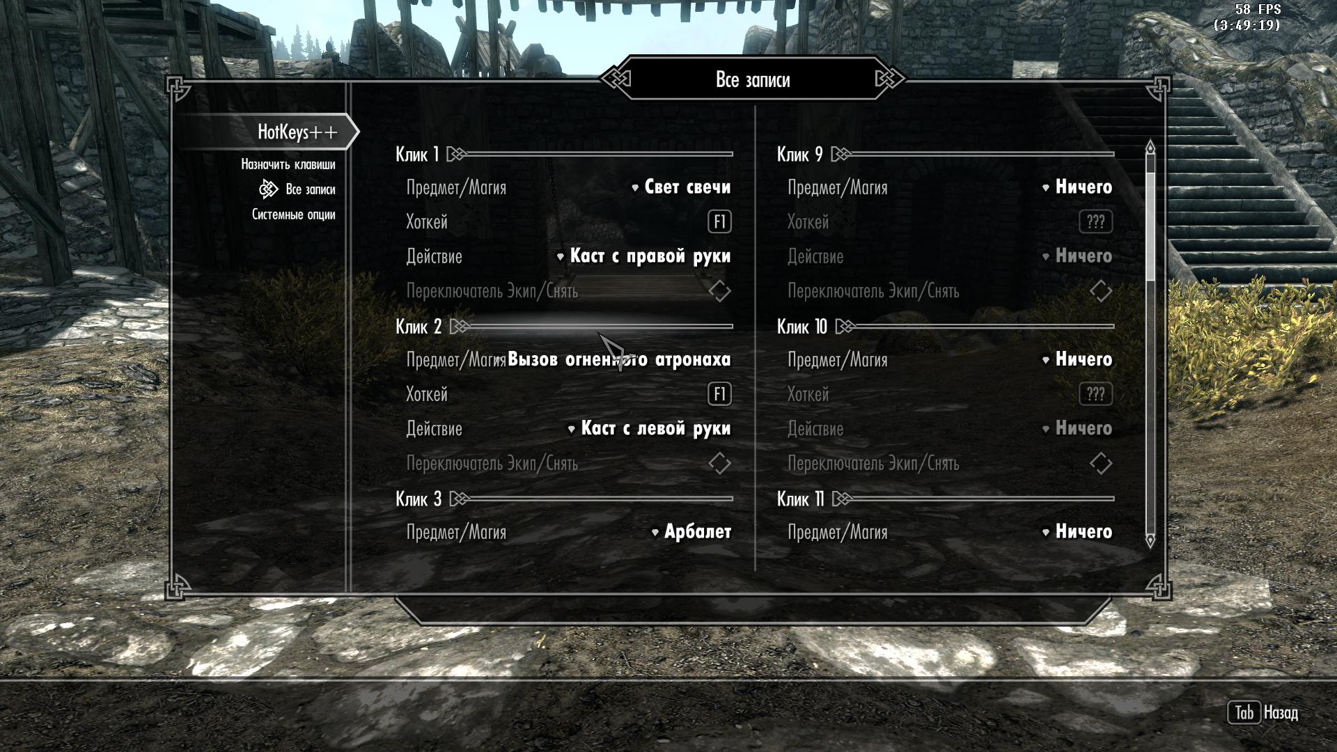 На скриншотах, показывающих 1 и 2 вкладки настроек, вы можете увидеть не очень понятное в данном контексте слово "Клик" (Клик 1, Клик 2 и тд). Дело в том, в английской версии было "Hotkey 1", "Hotkey 2" и тп. А то, что у меня переведено как "Хоткей" (в левой области) - это в оргинале тоже "Hotkey" но без цифр. Неприятный нюанс в том, что вещи/заклинания, указанные в области "Клик 1-2-3" могут висеть на одном хоткее (и будут экипироваться группой, если это броня-оружие, или кастоваться по очереди, если это настроенные заклинания); с другой стороны на второй вкладке МСМ-Меню можно каждый "Клик" подвесить на отдельный хоткей. В итоге под "Кликом" можно понимать и как "следующий шаг в цикле кастования/одевания" и в то же время как "совершенно отдельные действия, выполняемые по нажатию разных клавиш". Так что, если вы путаетесь, что это за "Клик" такой, не бойтесь экспериментировать, после 1-2 опытов все будет ясно :)