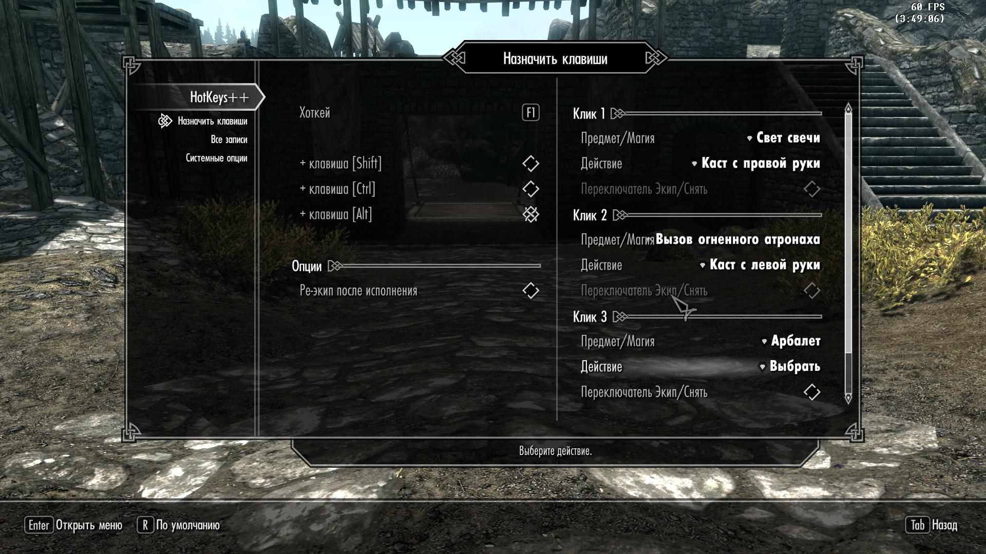 Мод также предоставляет возможность назначить на один хоткей несколько действий, выполняемых одно за другим. Эта возможность удобна, если вы играете магом и регулярно пользуетесь и перекастовываете заклинания типа "Морозный плащ", "Каменная плоть" и тд и тп. Достаточно один раз настроить последовательность заклинаний, "подвесить" на удобный хоткей, а потом нажать его - и персонаж сам накинет на себя все необходимые баффы и прекасты, а потом (если настроено как надо) еще и экипирует обратно оружие/заклинания, которые были у него экипированы до нажатия хоткея.