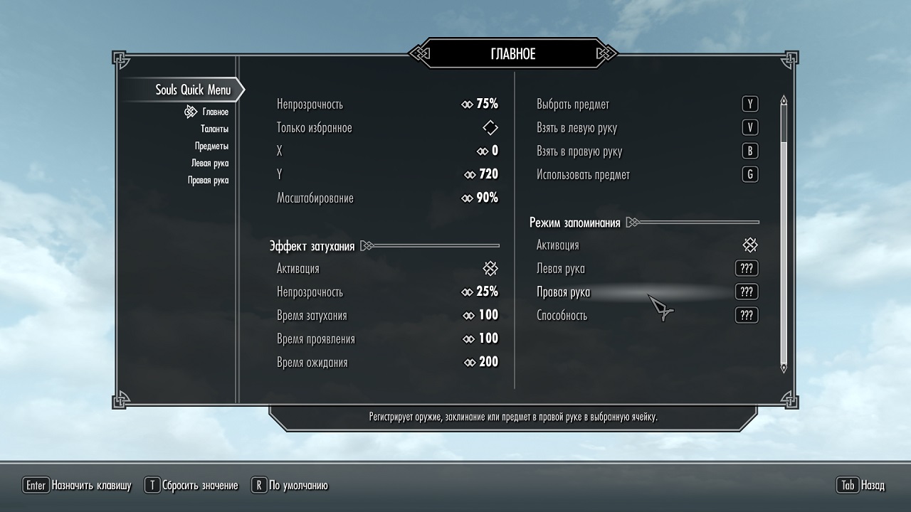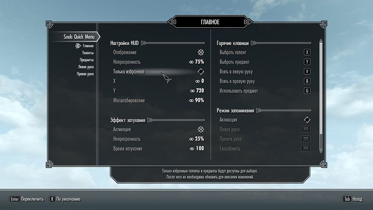 В меню мода доступны настройки прозрачности элементов, время их затухания, также возможно переназначить горячие клавиши.