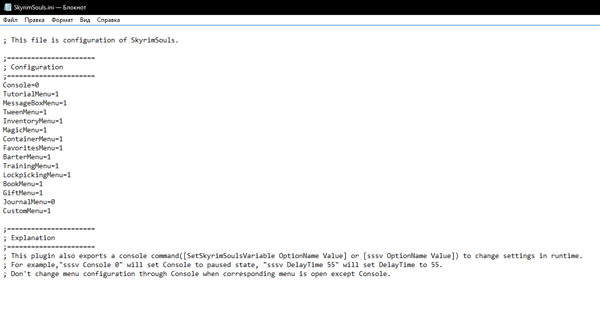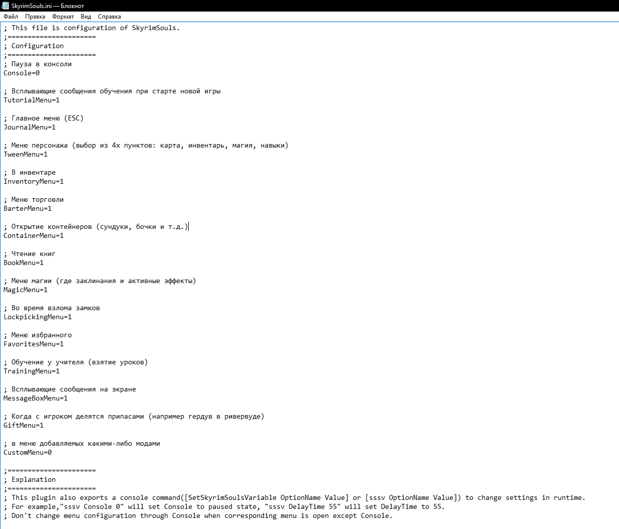 В настройках плагина SkyrimSouls.ini добавлено описание каждого пункта на русском (см. скриншот), переведены все комментарии для удобства. Специально для вас - творческое объединение MODZADROT.