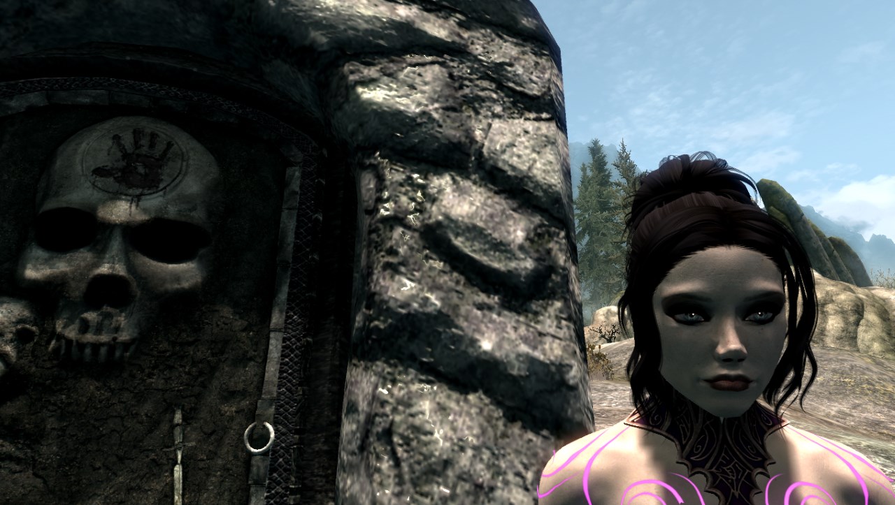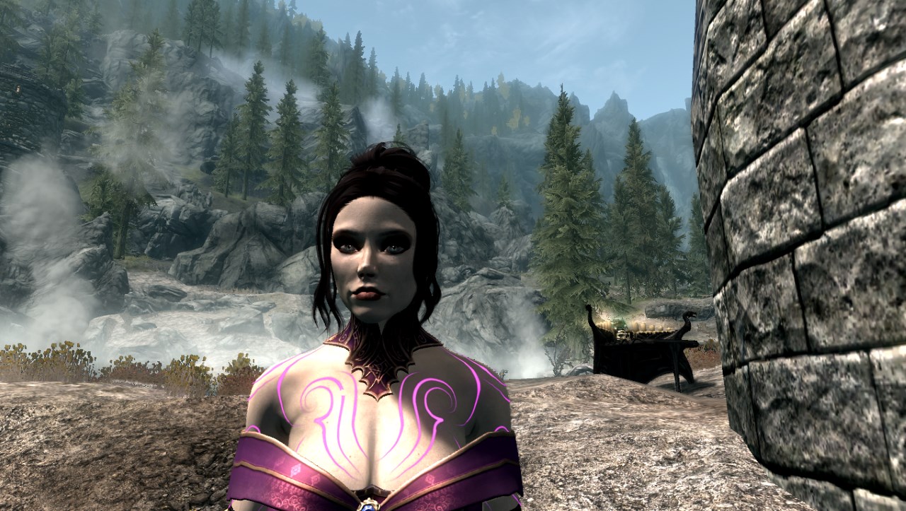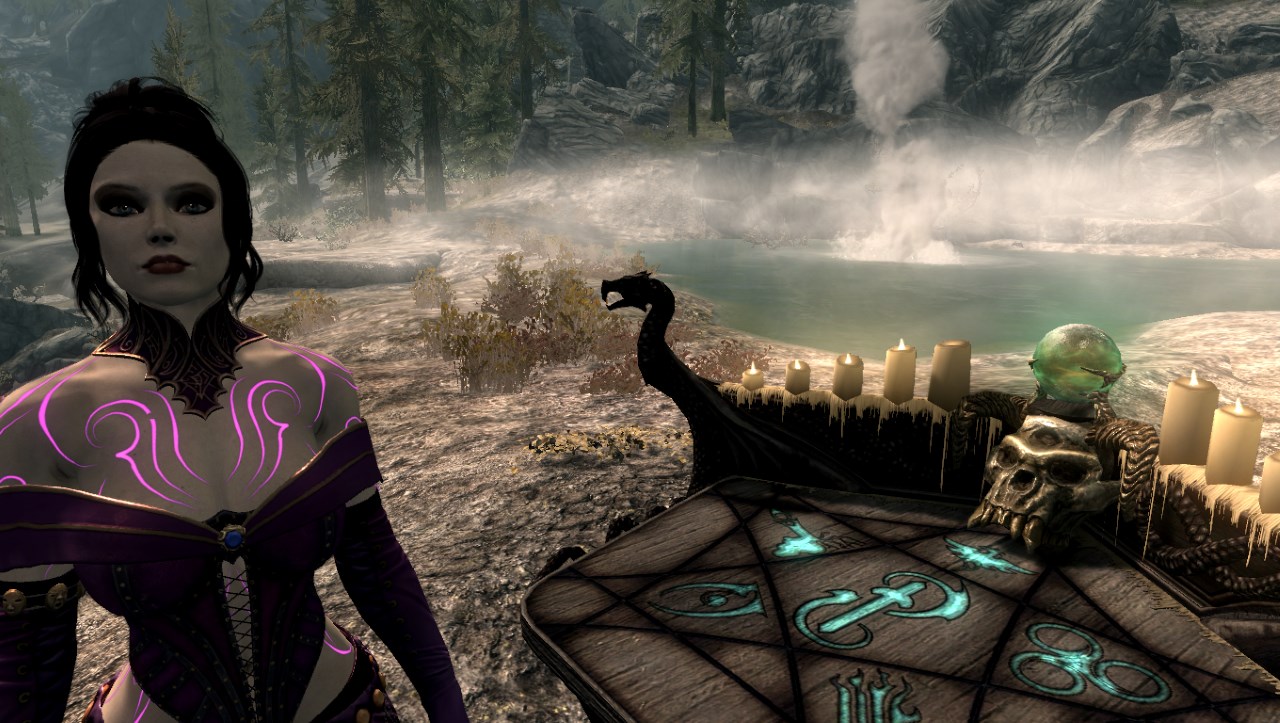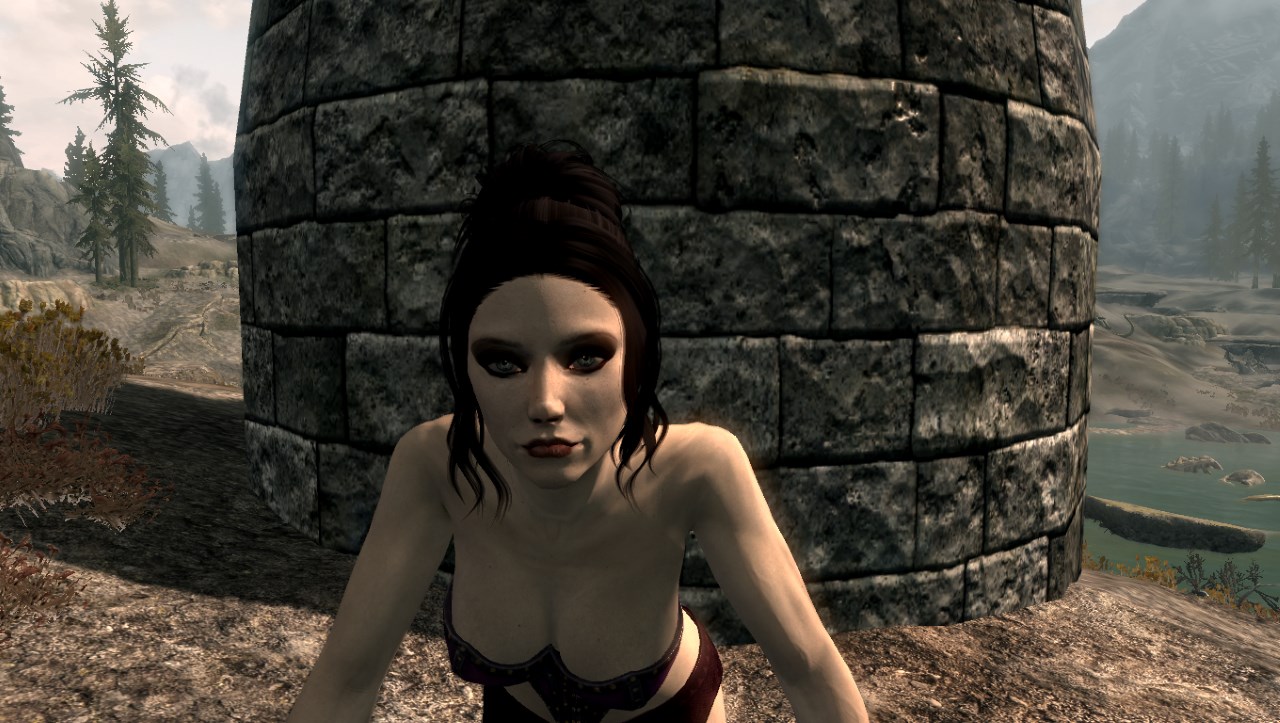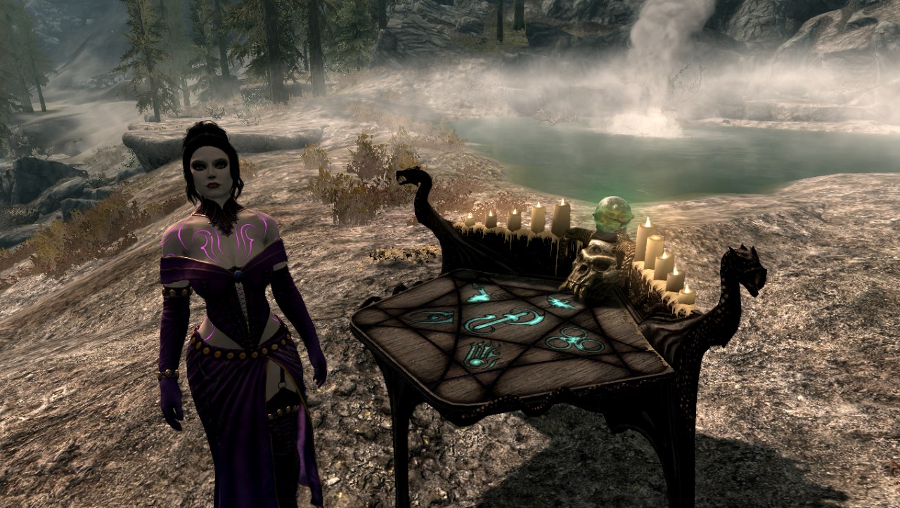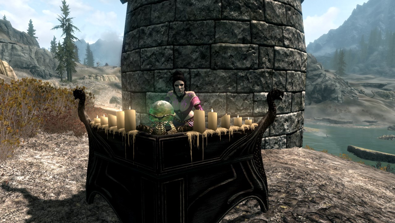 Описание: Найти Виолетту можно неподалеку от Камня Атронаха, возле небольшой башни Темного Братства, где она занимается изучением пентаграммы душ (см. картинки).