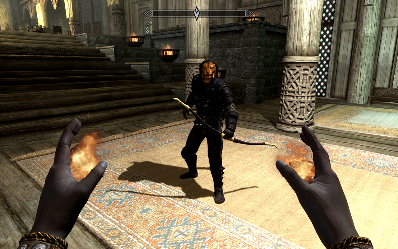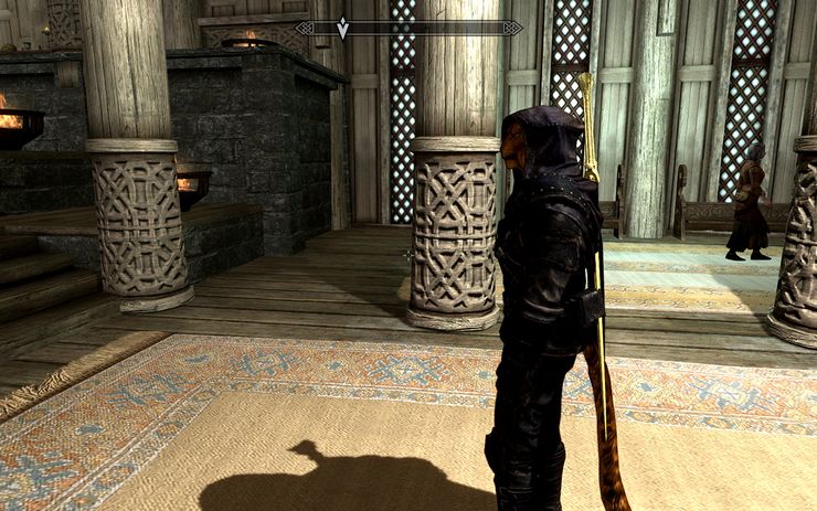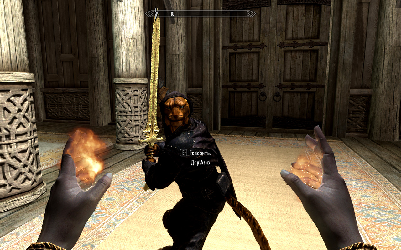 Что касается самого компаньона, вы можете спросить его о необычном оружии, которое он держит у себя или же просто невзирая ни на что бродить с ним по Скайриму в поисках удачи.
