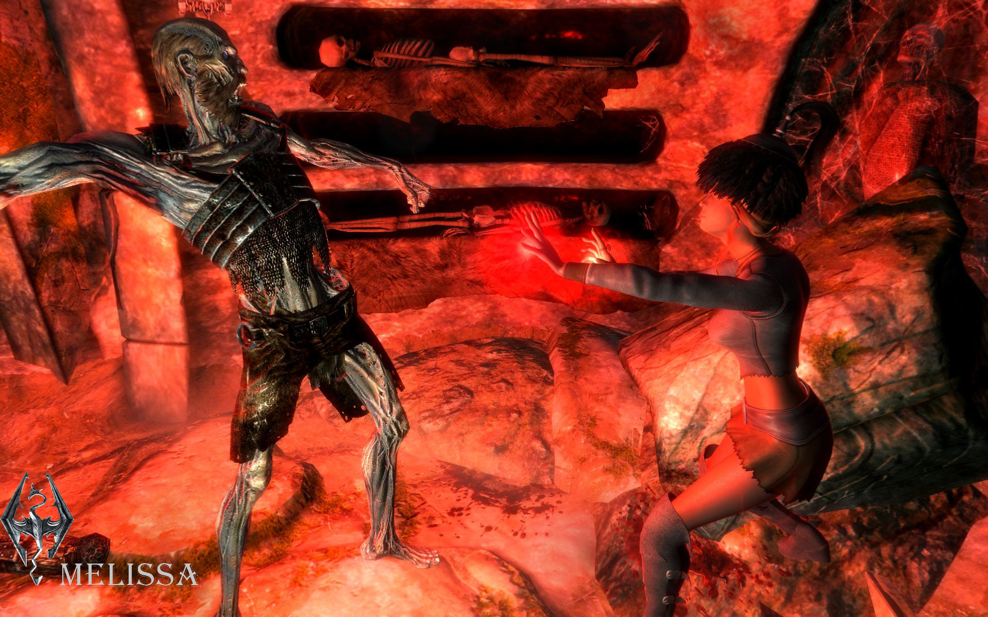 5. Лиса умеет определять слабые стороны врага и применяет к ним соответствующее оружие/магию. Так, двемерские машины она бьёт оружием, вампиров – огнём, огненных атронахов – холодом и т.д. Естественно, Лиса применяет весь арсенал, но предпочтение отдаёт более эффективному оружию для данного противника. Заклинания на отталкивание и сбивание с ног у Лисы работают на всех актёрах, даже на двемерских машинах и великанах, не работает только на драконах.