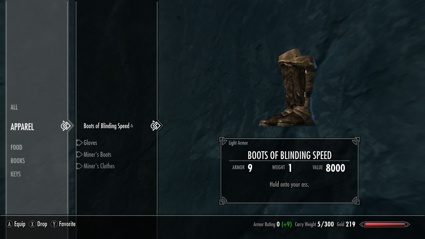 Мод добавляет в игру Сапоги Ослепляющей Скорости из TES III: Morrowind (думаю, в описании сапоги не нуждаются), этот мод изначально сделан для SSE, но мне удалось адаптировать его для SLE.
