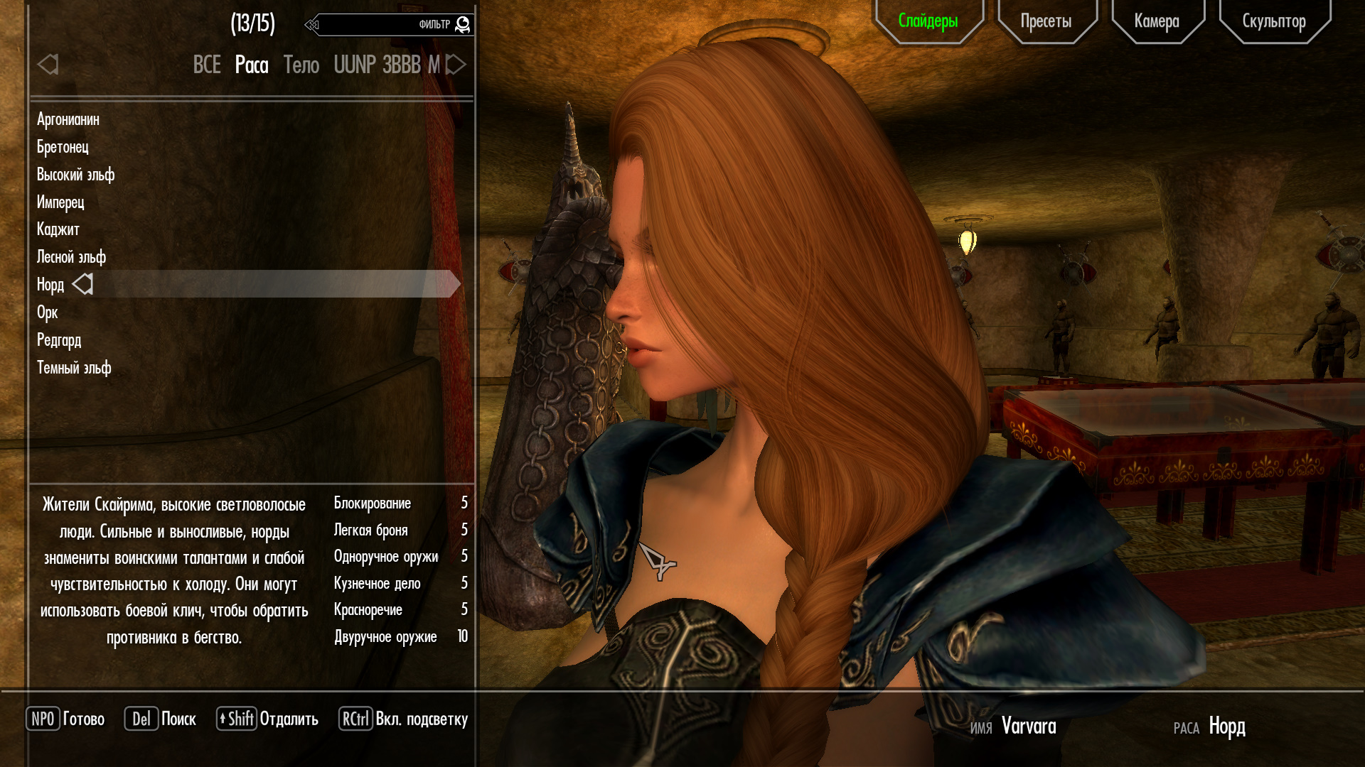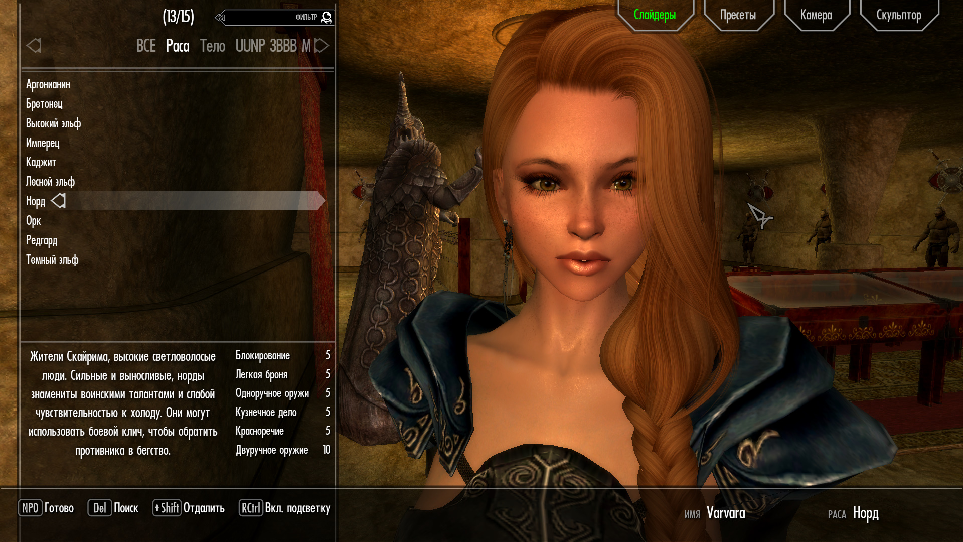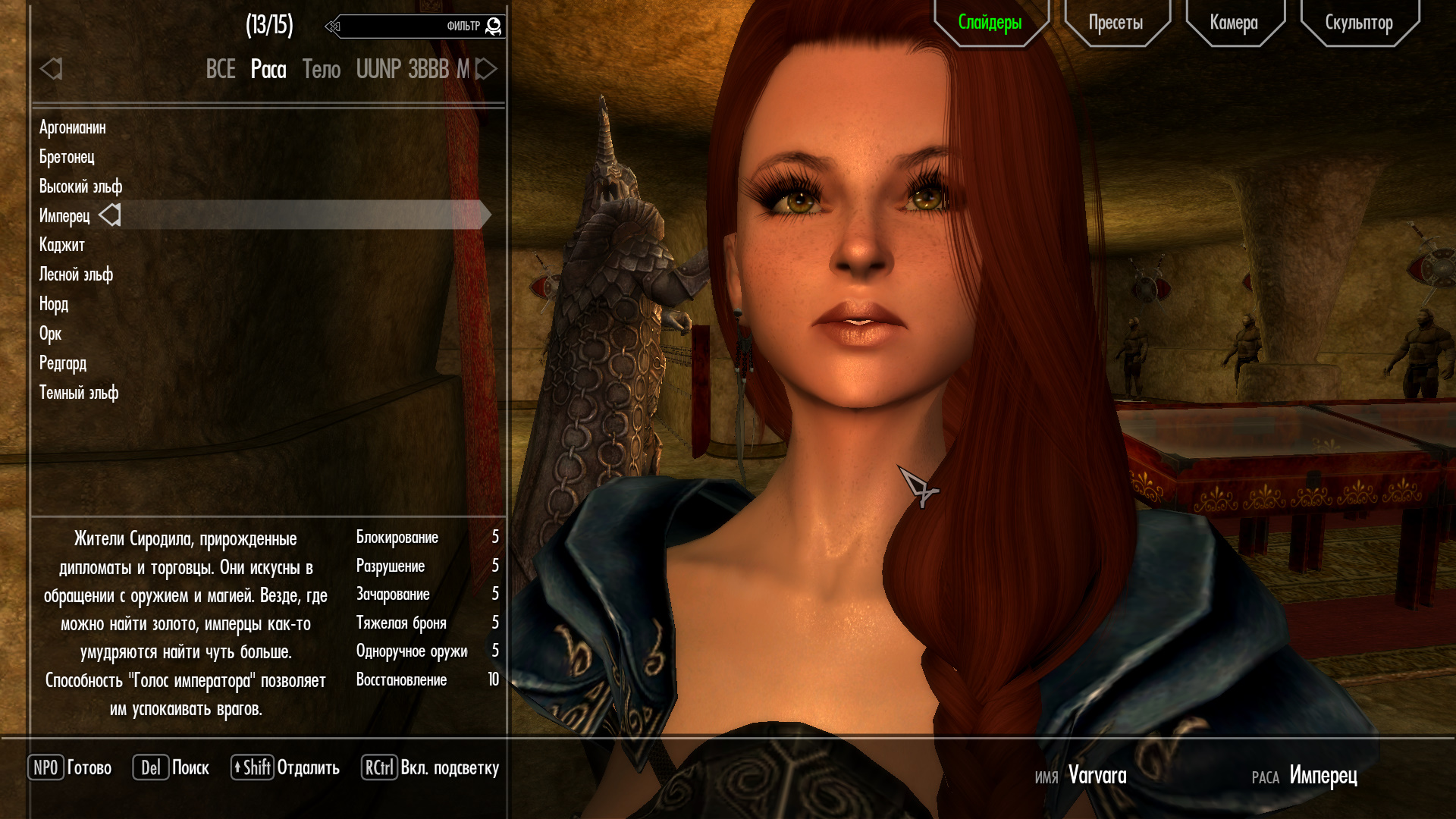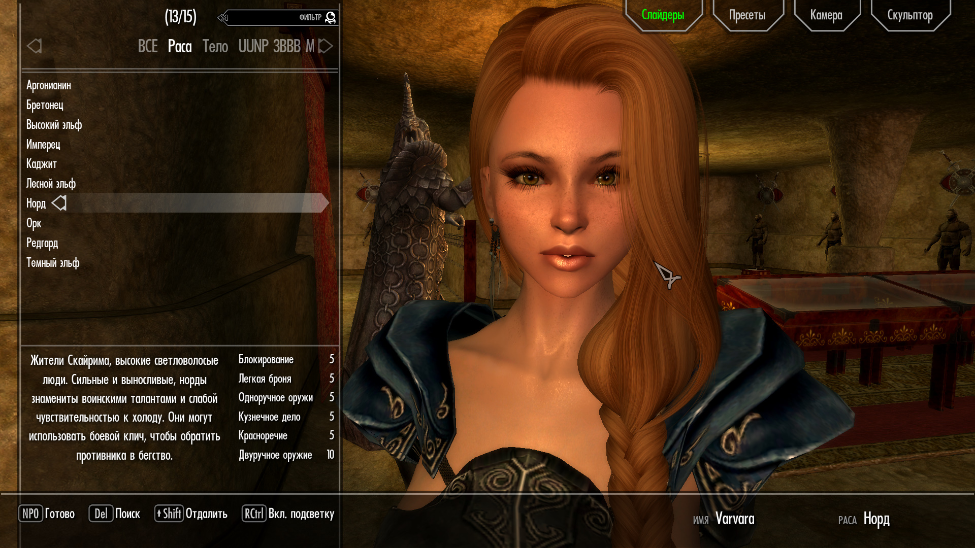 Начальное имя пресета Алиса, но она создавалась параллельно с Варварой. Пресет адаптирован для двух рас - Норд и Имперец (по просьбе одного человека), вес 100, рост 1.00. Глаза и брови ваниль, волосы SG Hair Pack.
