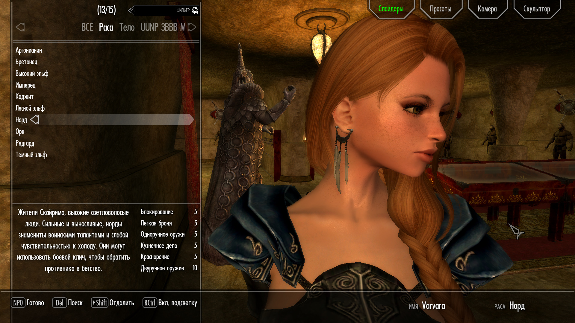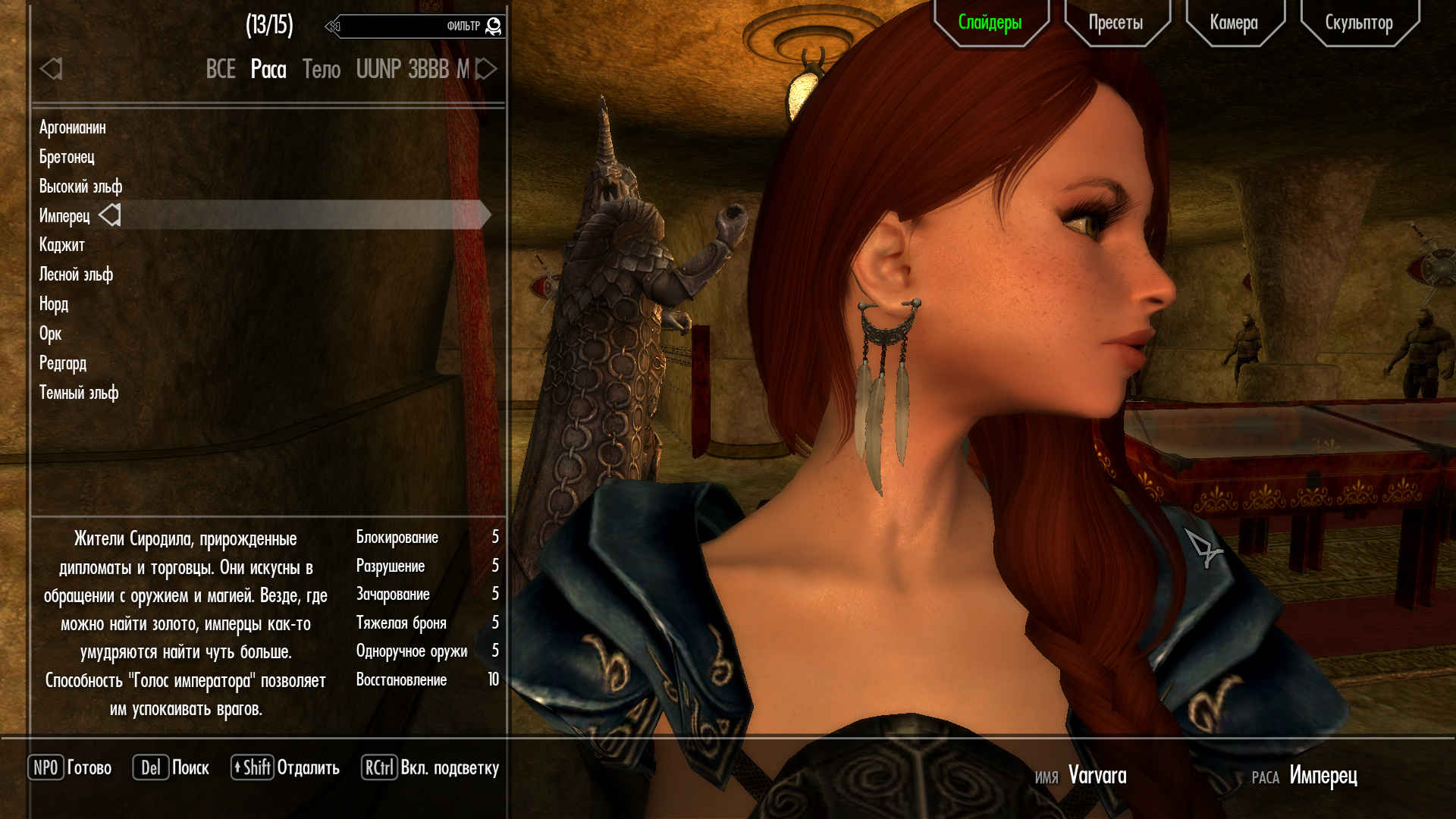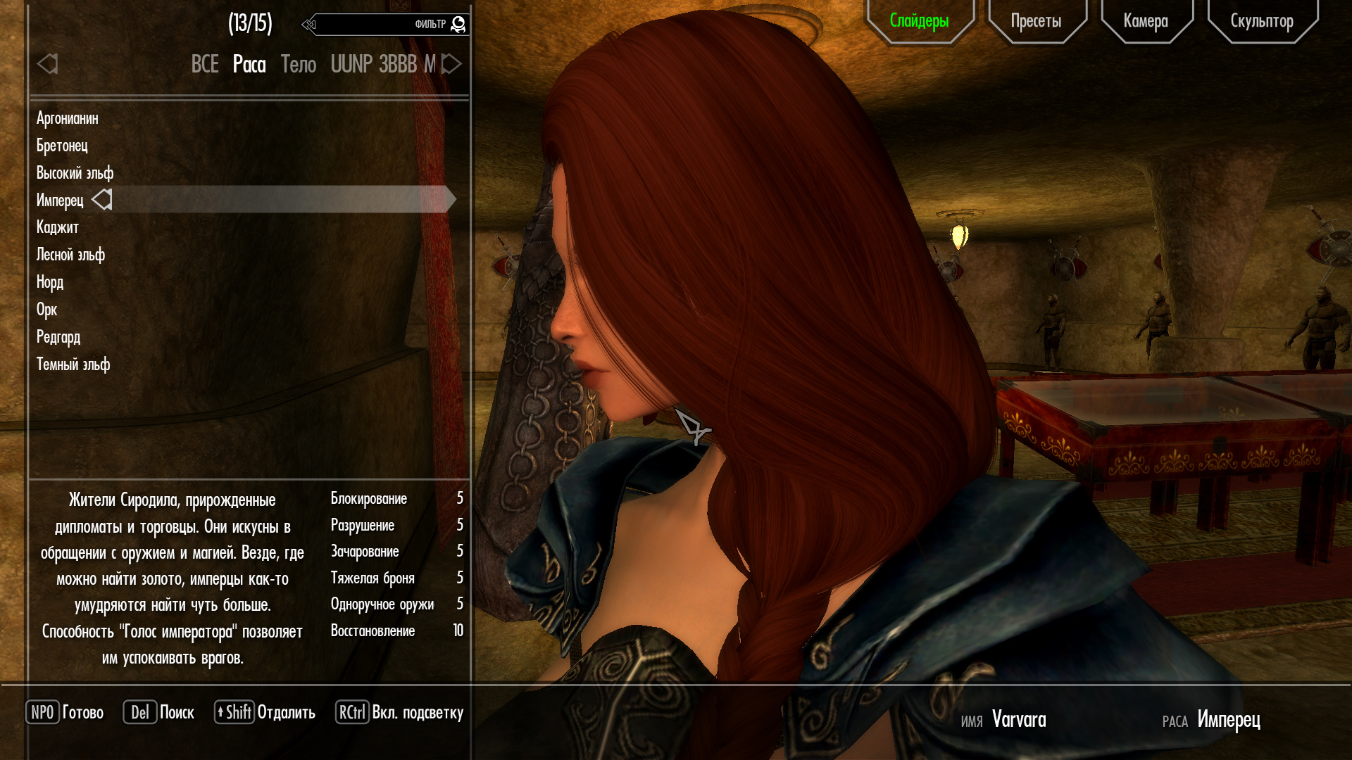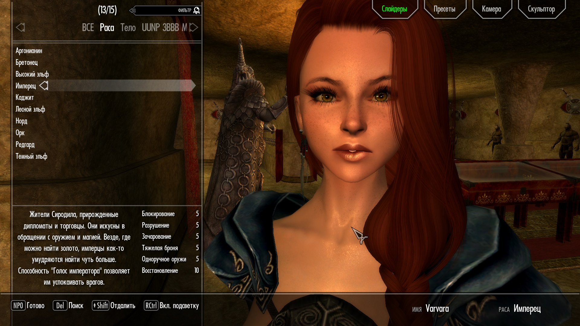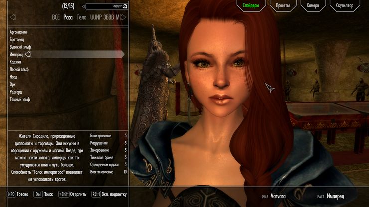 Начальное имя пресета Алиса, но она создавалась параллельно с Варварой. Пресет адаптирован для двух рас - Норд и Имперец (по просьбе одного человека), вес 100, рост 1.00. Глаза и брови ваниль, волосы SG Hair Pack.