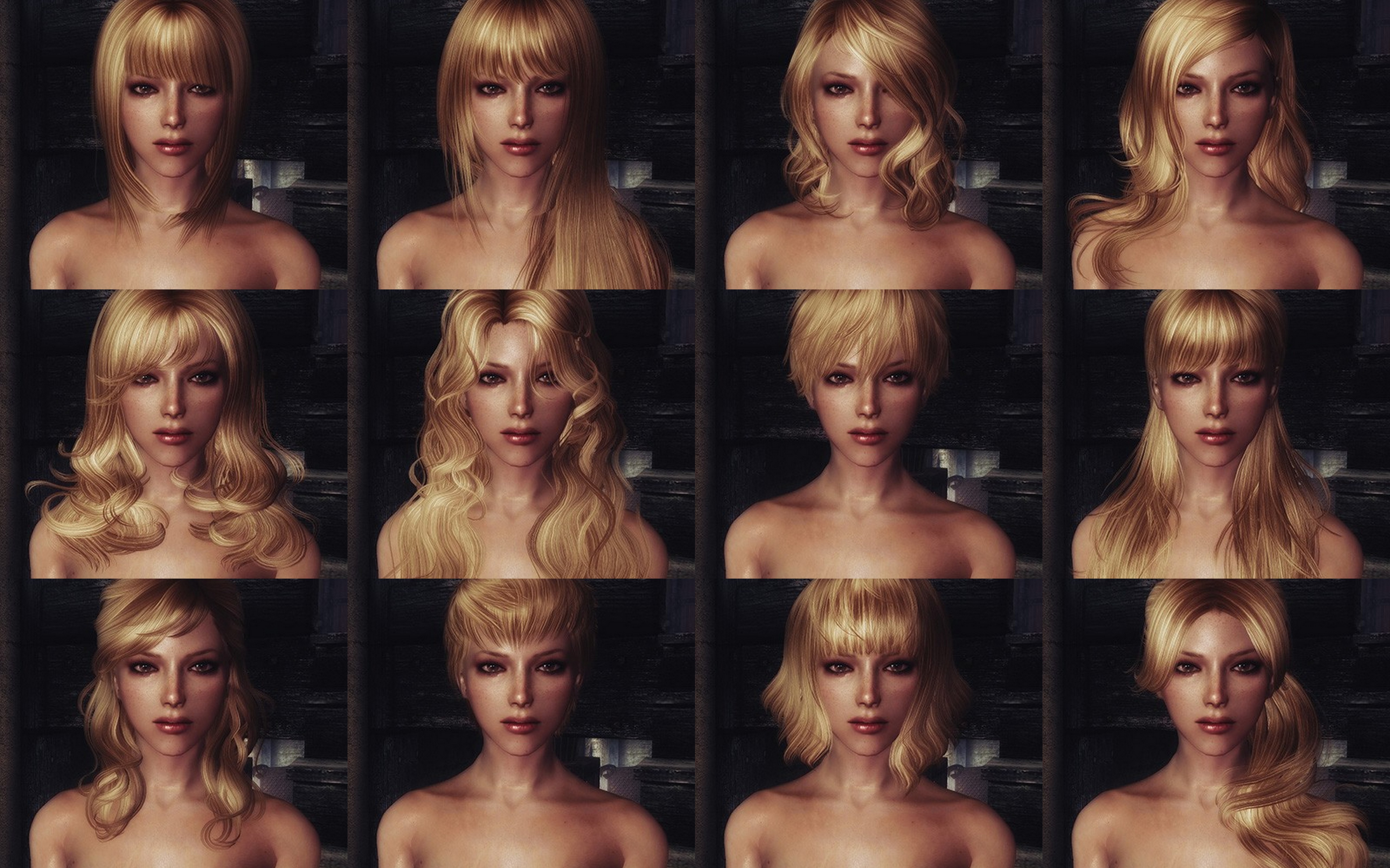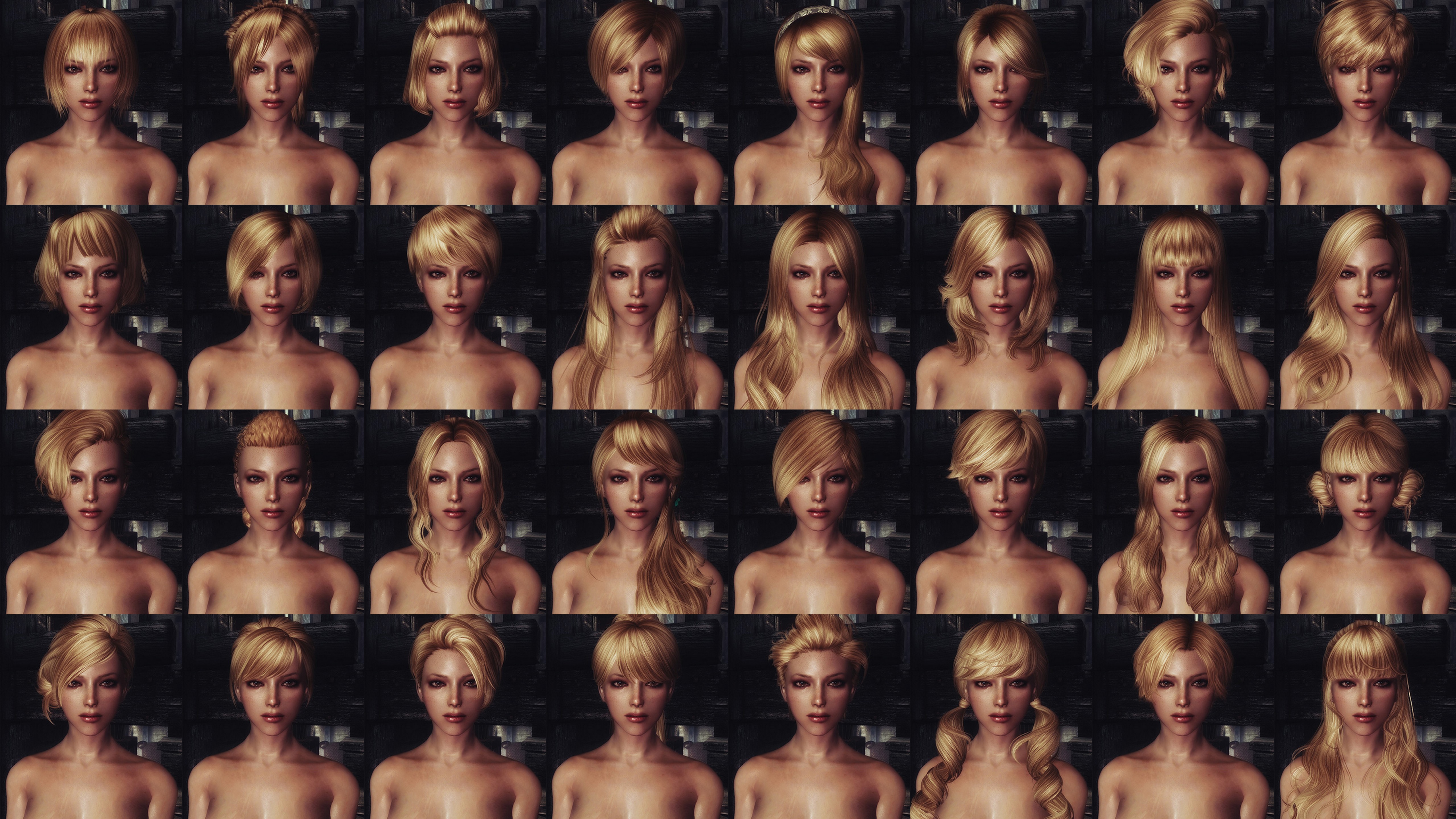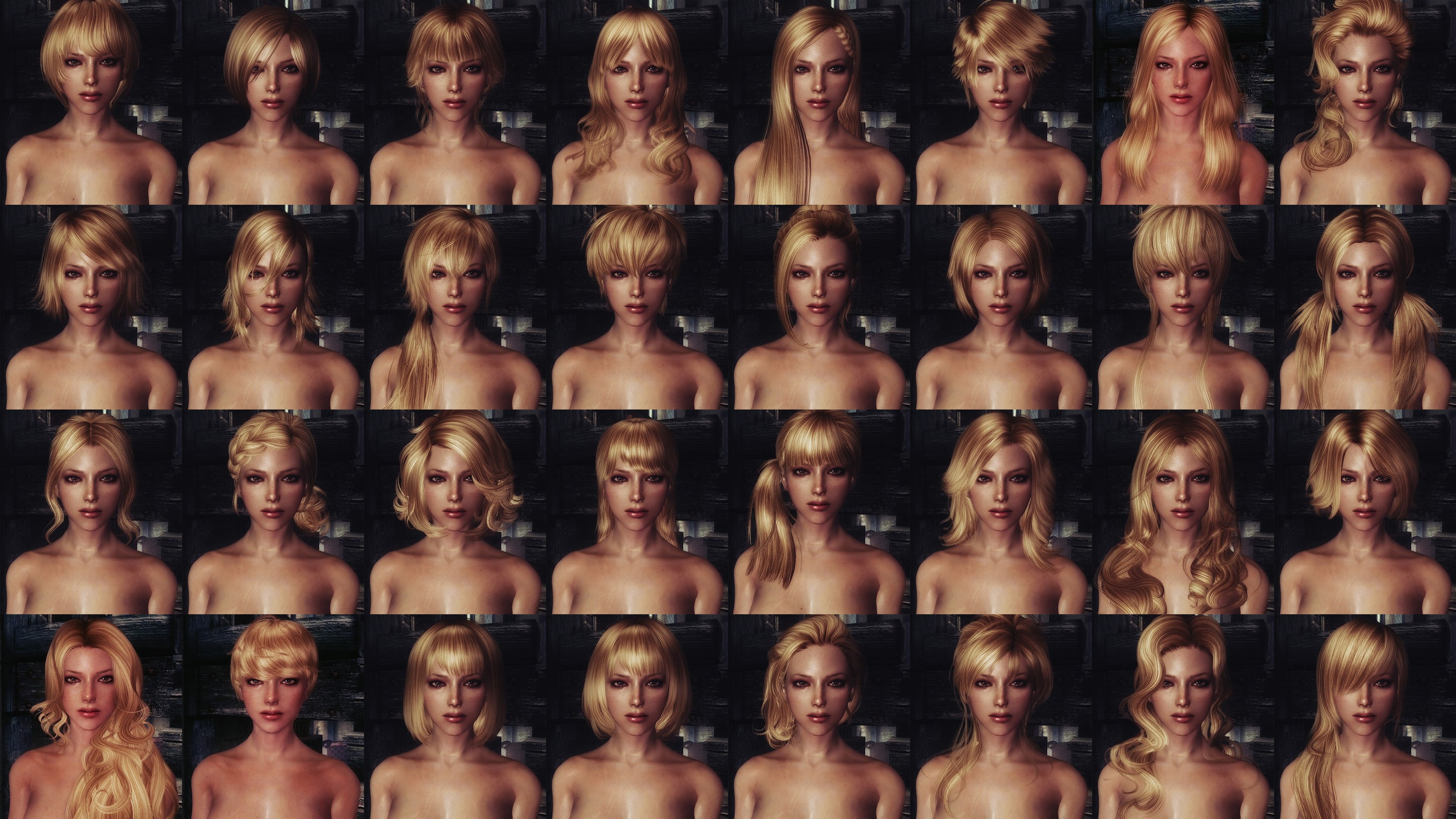 Добавляет 268 женских причесок для персонажей человеческих рас (норды, бретоны, имперцы, редгарды). Волосы оптимизированы для моделей голов ECE и для моделей тел UNP (если у вашего персонажа большие сиськи, то волосы с длинными прядями, падающими спереди, будут врезаться в тело).