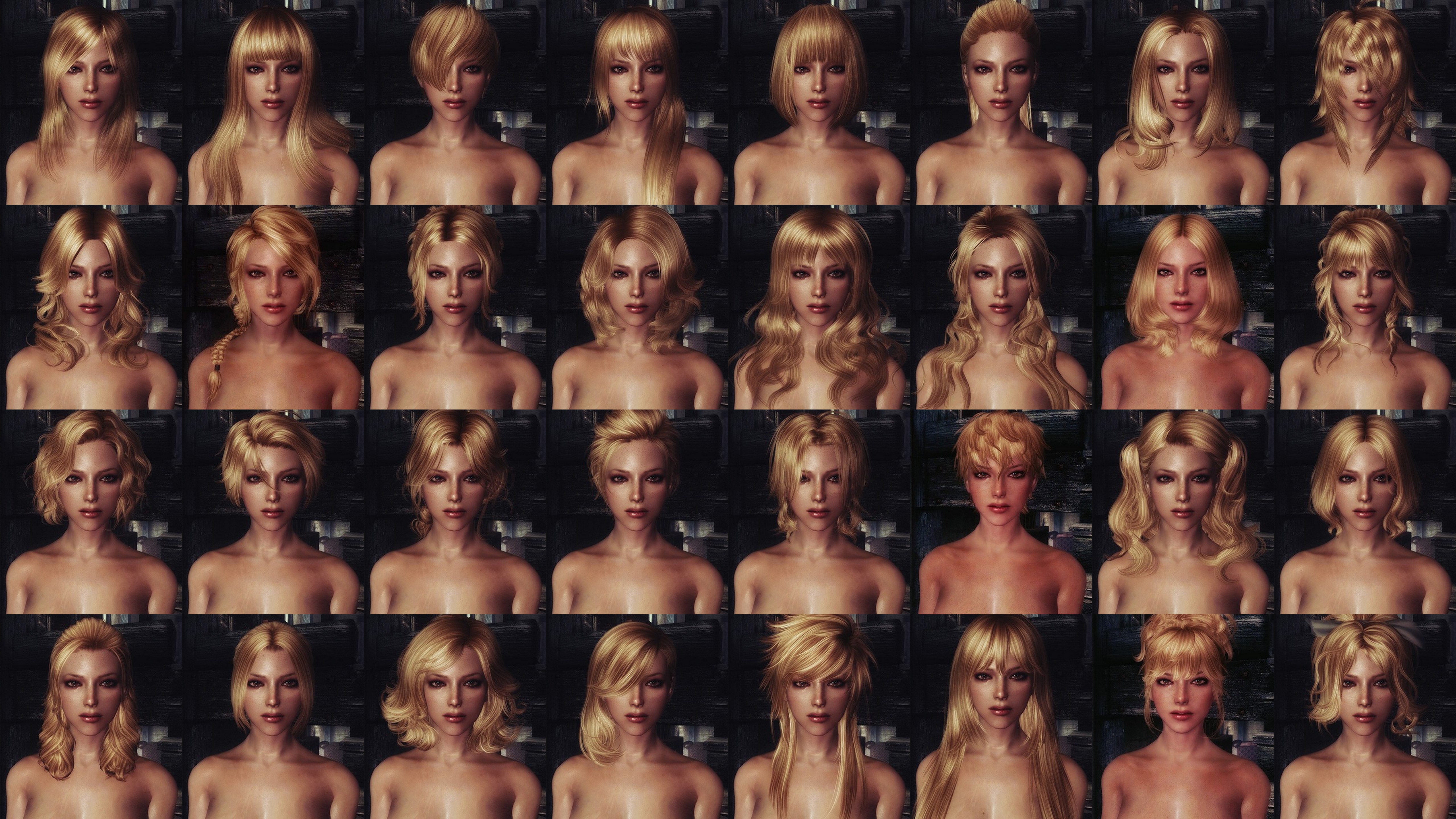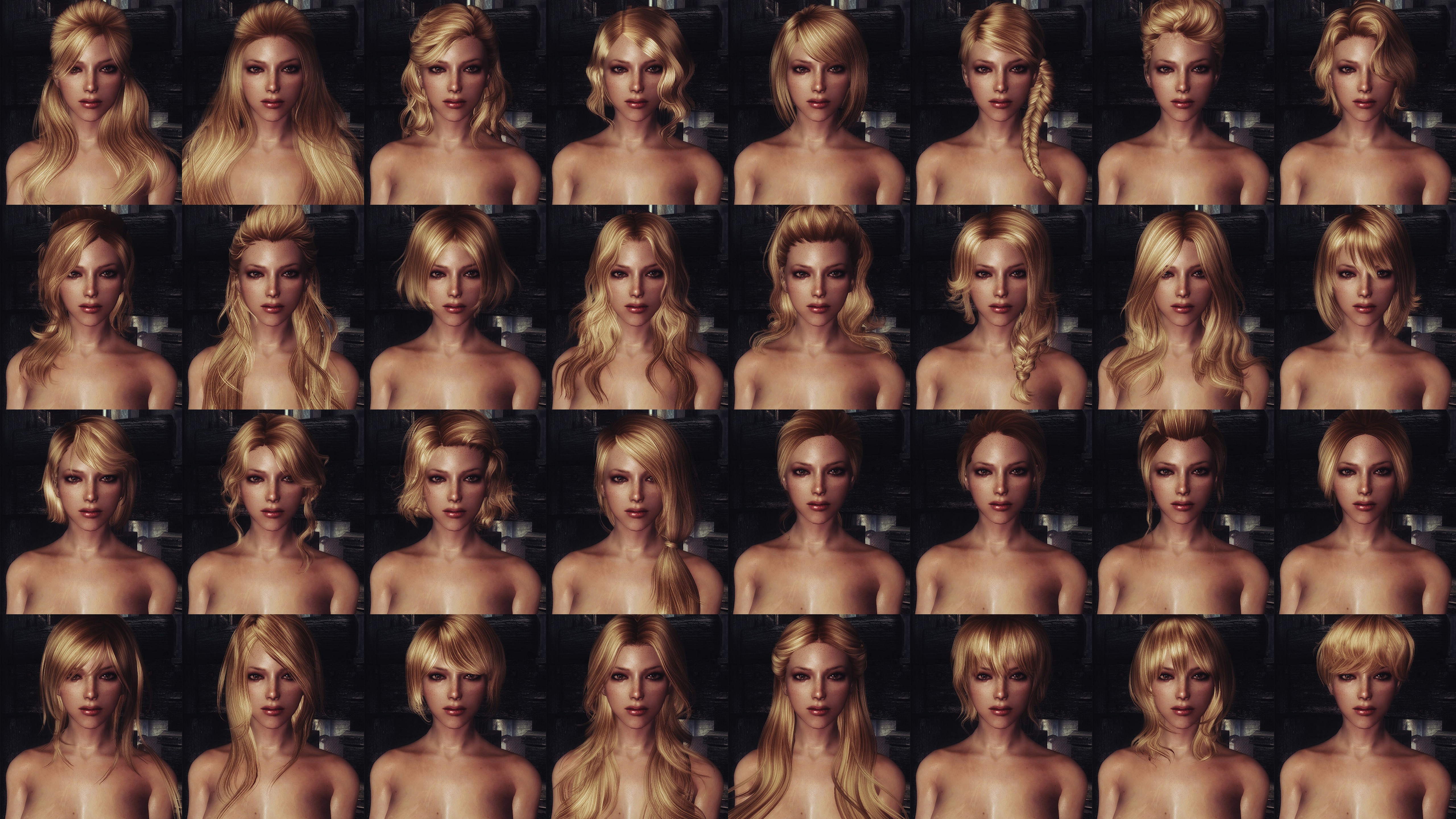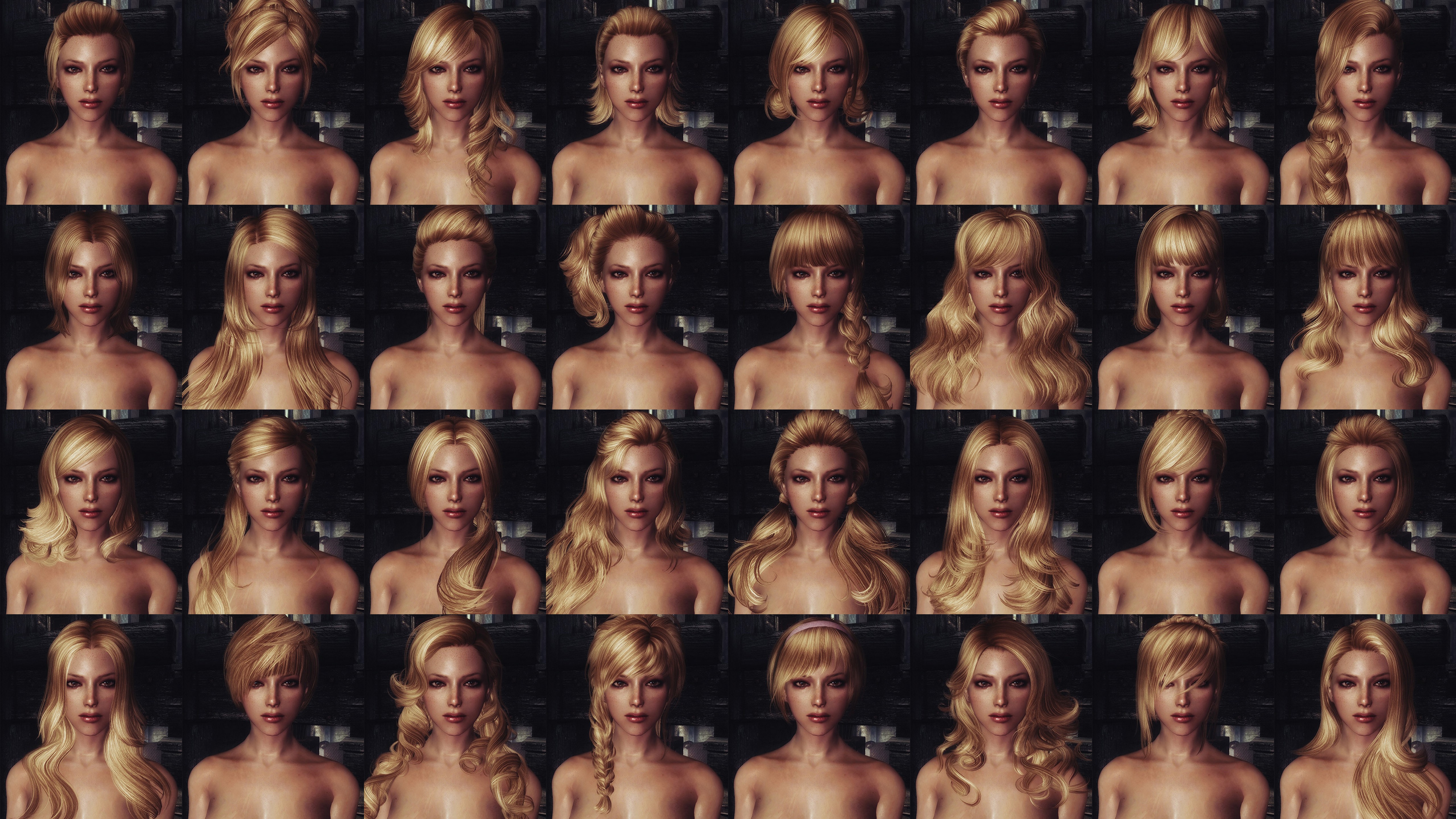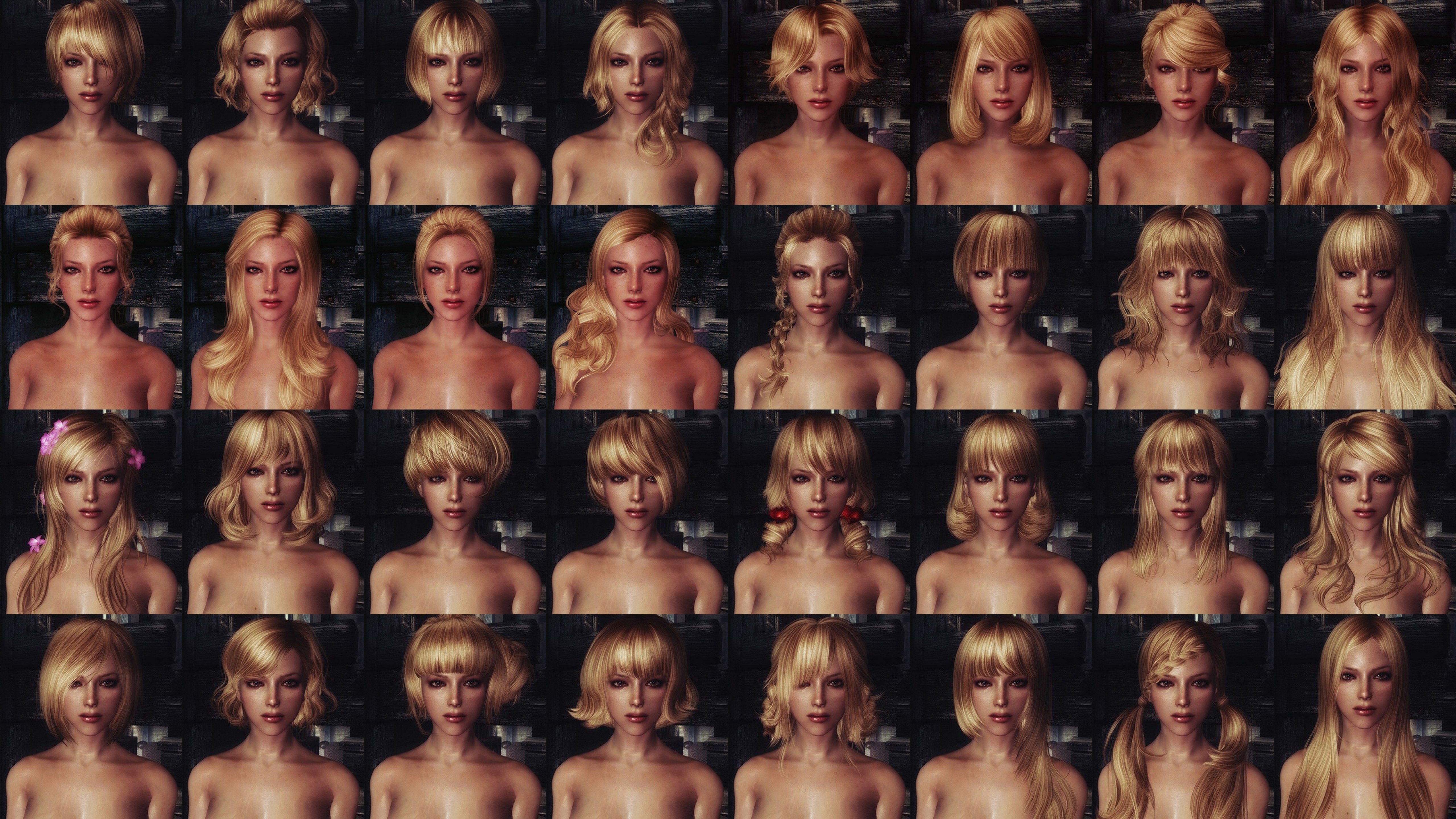 Добавляет 268 женских причесок для персонажей человеческих рас (норды, бретоны, имперцы, редгарды). Волосы оптимизированы для моделей голов ECE и для моделей тел UNP (если у вашего персонажа большие сиськи, то волосы с длинными прядями, падающими спереди, будут врезаться в тело).