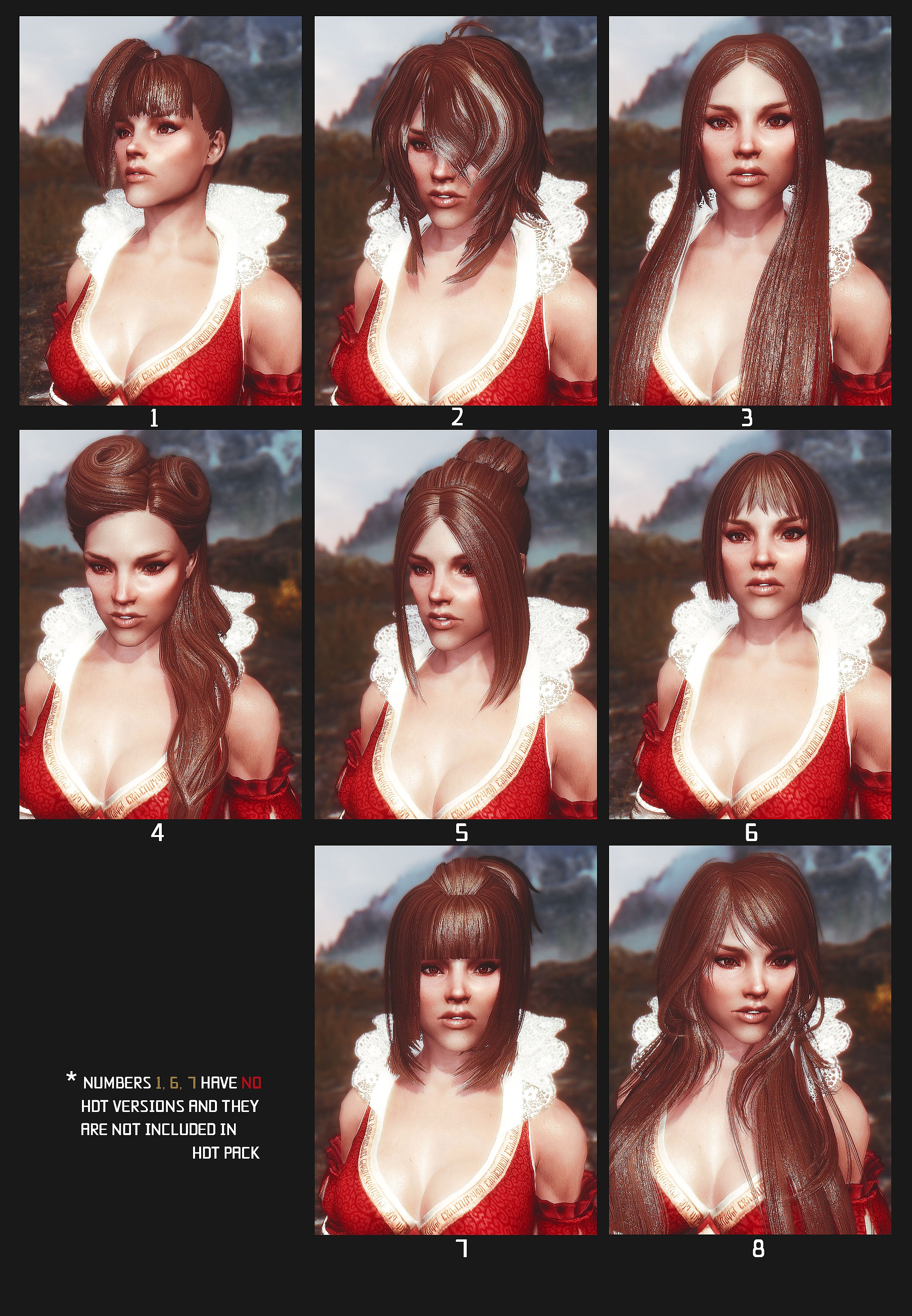 Мод добавляет 5 женских причесок с HDT физикой, также имеется альтернативный сборник, содержащий 8 статических причесок, альтернативный сборник не требует HDT Physics Extension.