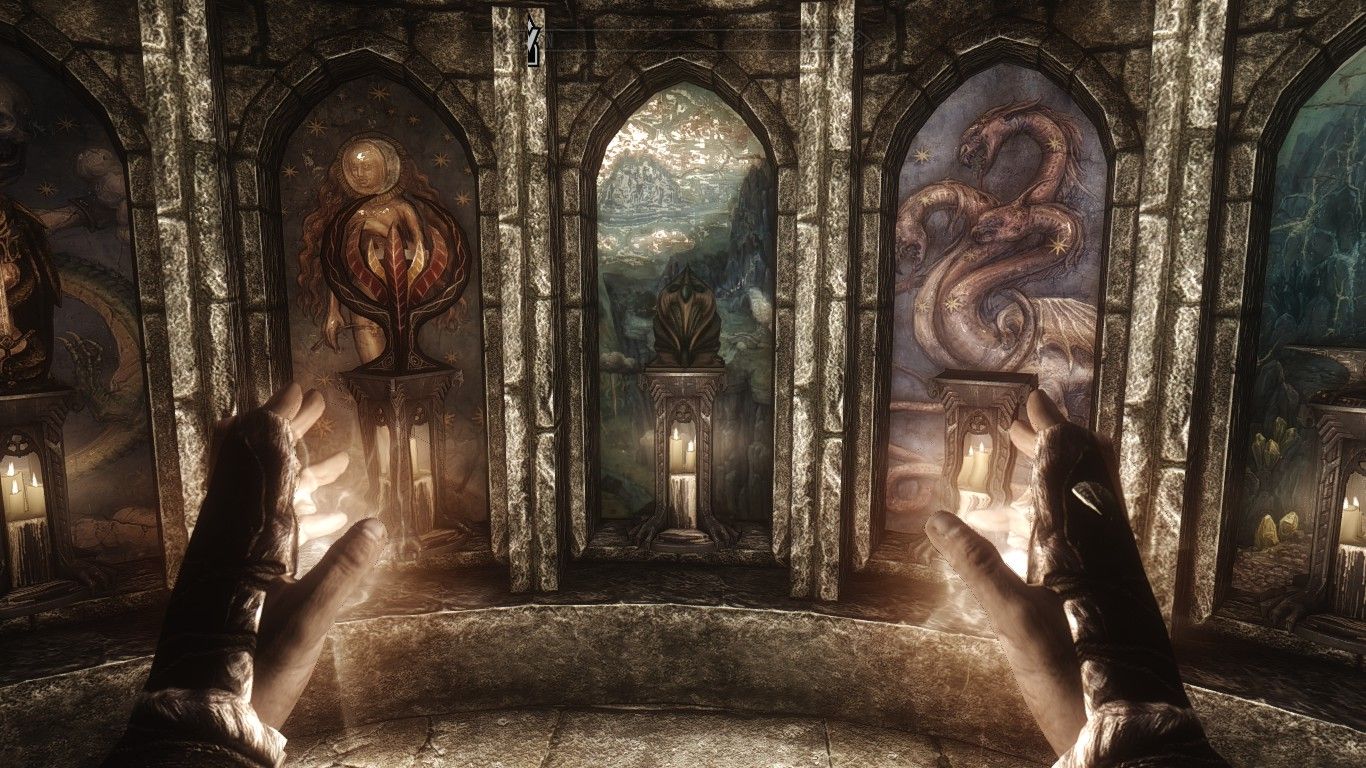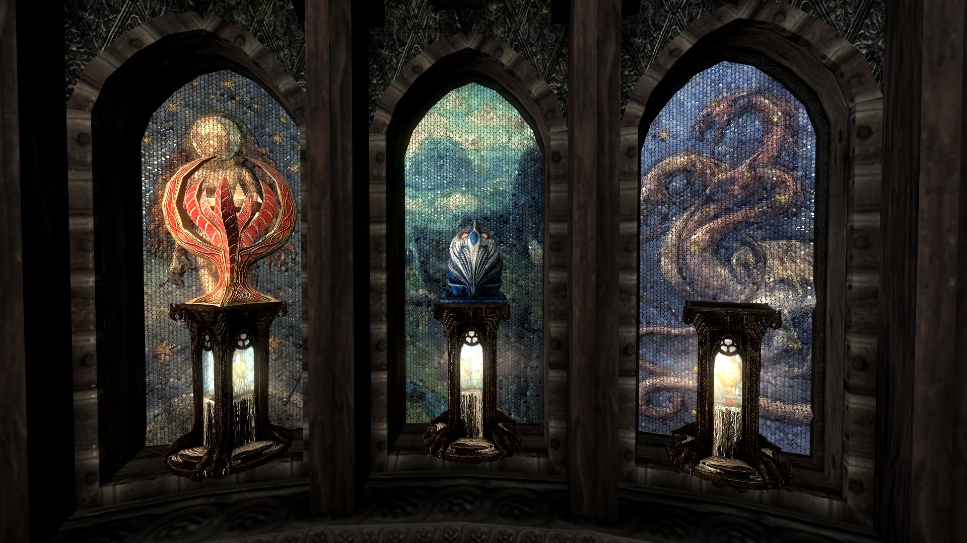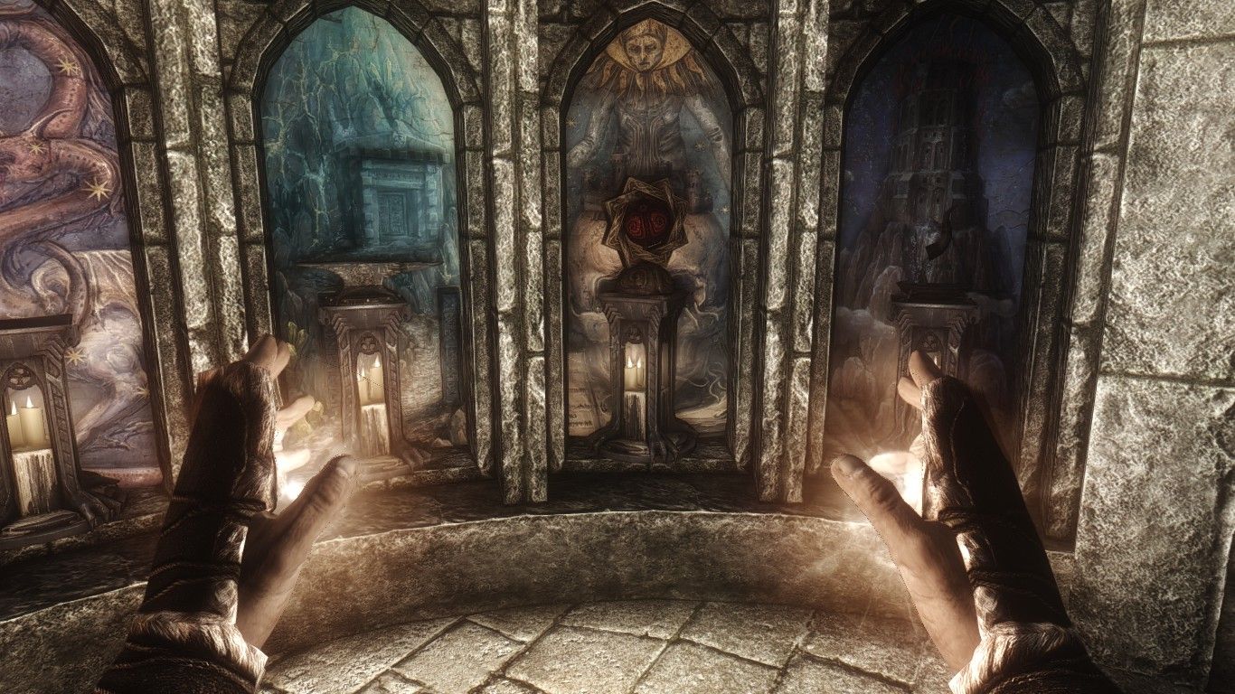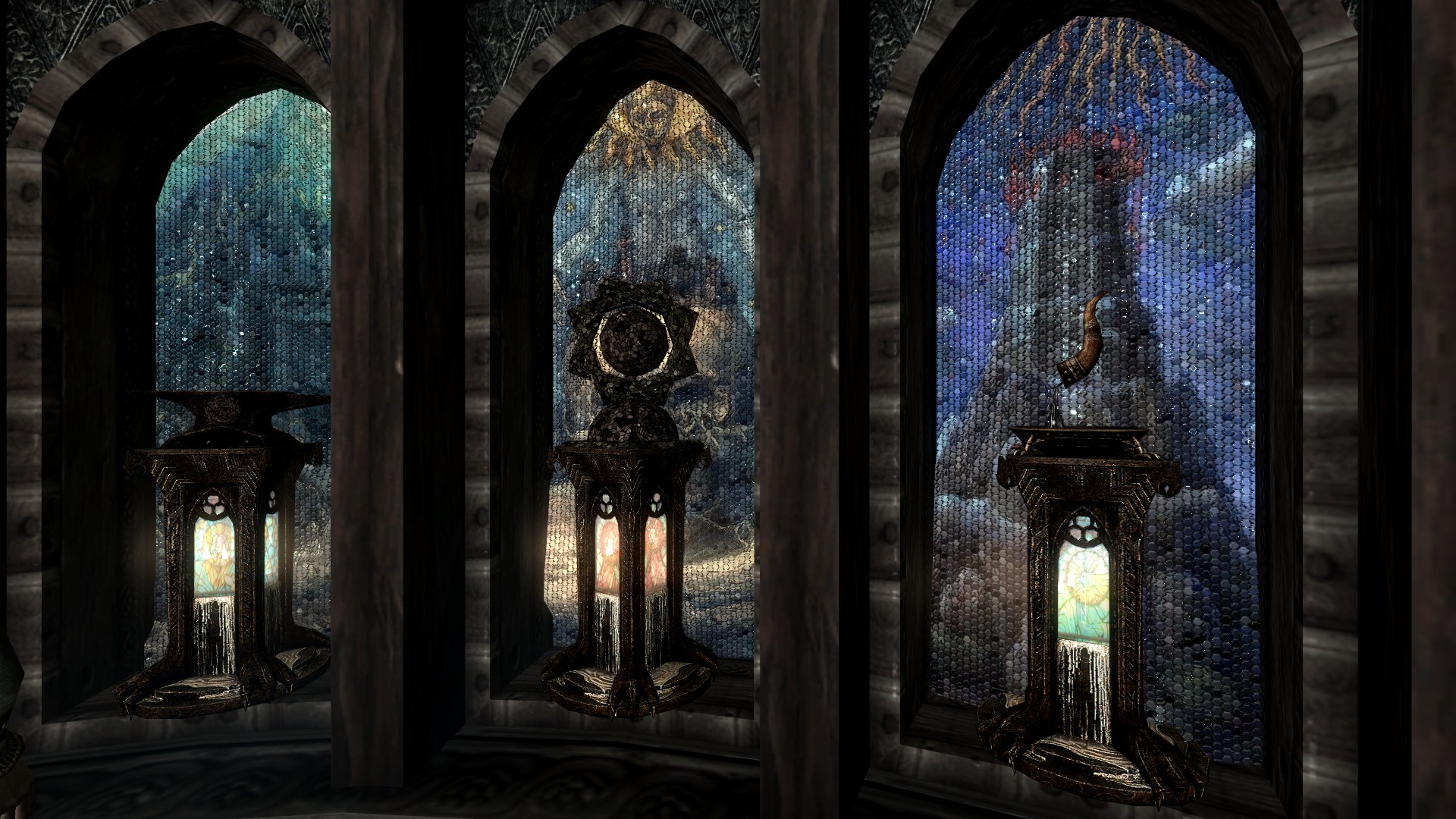 - фрески добавлены в Храм Богов Солитьюда, все залы мертвых, прочие храмы и места, имеющие алтари (а именно: в ночлежку Хельги, храмы Талоса, Мары, Дибеллы, Кинарет; покои архимага, Зал стихий, Арканеум - в Коллегии Винтерхолда, естественно; Мрачный Замок (Императорская Башня), внутреннее святилище храма Ауриэля).