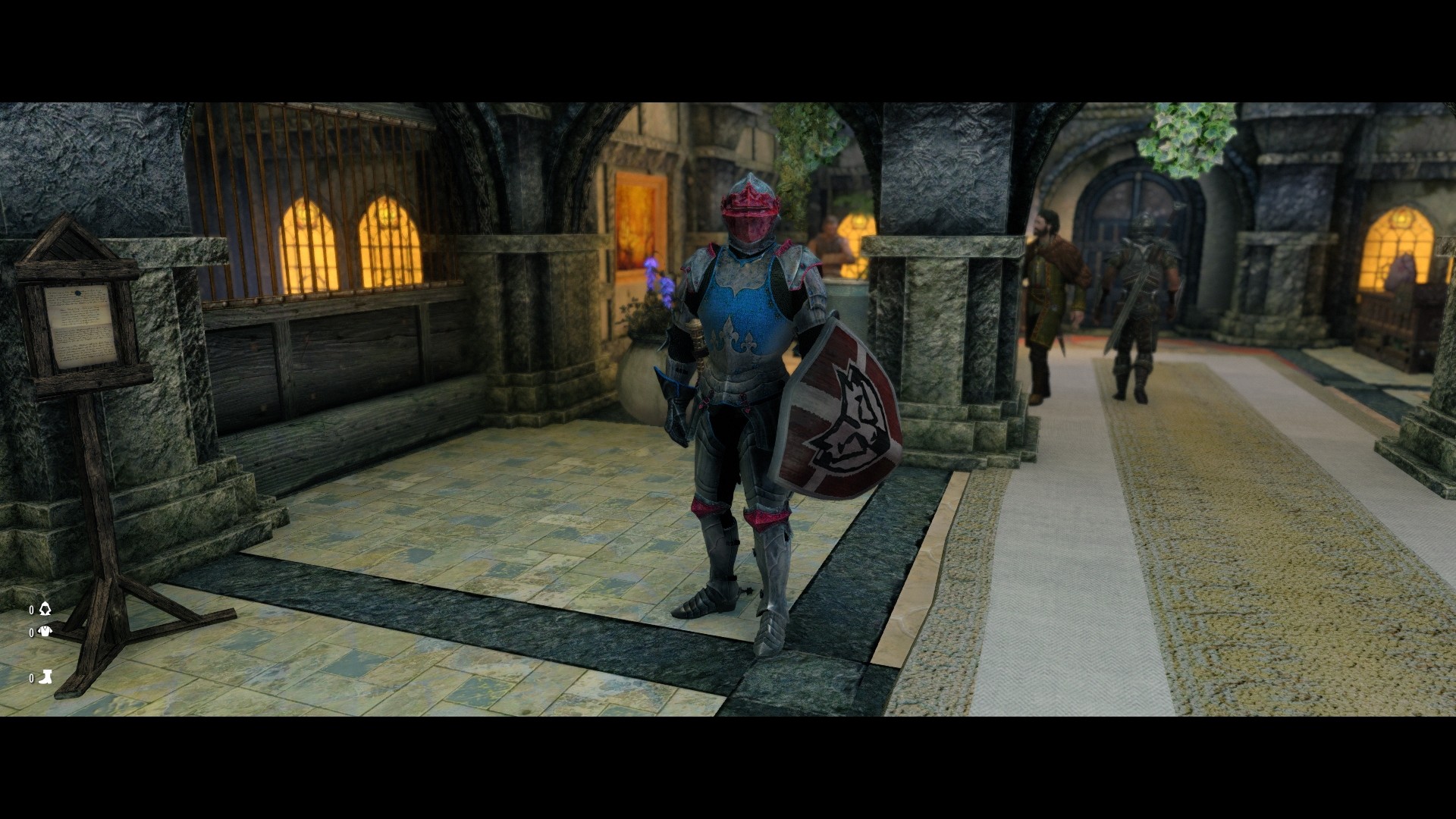 Капитан гвардии Алдис носит уникальный черно-красный рыцарский знак с эмблемой Солитьюда, чтобы показать своё положение. Они больше не будут носить обычные стальные доспехи и броню стражников. Проклятье, это же имперская столица!
