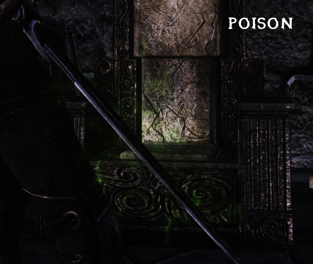 Добавлены чары для контактного удара: яд. Его можно сочетать с обычными ядами, так как система полностью отделена. Оружие с отравлением можно найти как обычную добычу.