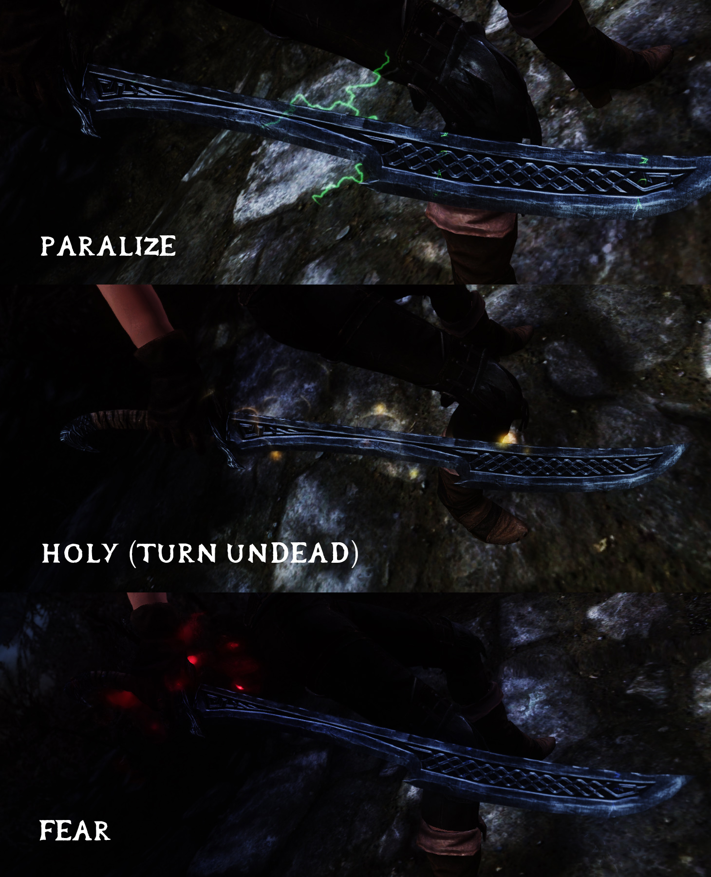 Зачарованное оружие также способно бросать лучи в версии 2.0, для этого требуются соответствующие перки заклинания.
