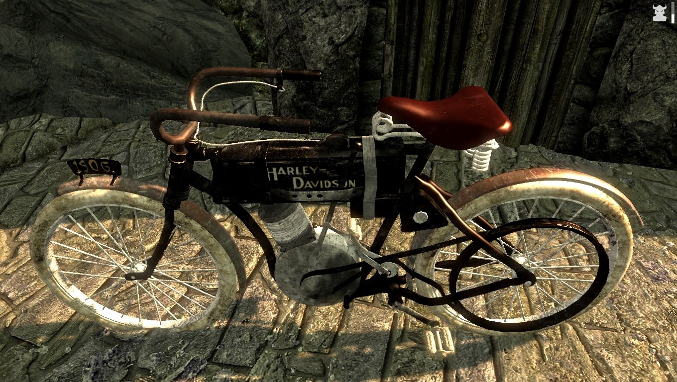 Мод добавляет в игру Скайрим мотоцикл Harley Davidson 1906 года выпуска. У входа в Заброшенную тюрьму найдете старый припаркованный Харлей. Загляните в его багажник и найдете книгу призыва данного раритетного мотоцикла. Изучив заклинание, сможете призывать мотоцикл в любой локации на 2 минуты реального времени. В мотоцикле, где будет найдена книга, можете хранить свои вещи (контейнер абсолютно безопасен).