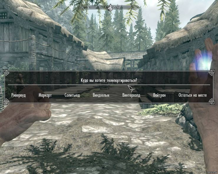 При входе в игру вам добавится заклинание телепортации в несколько городов Скайрима. В отличие от быстрого путешествия работает из внутренних ячеек, при нападении стражи, в присутствии врагов и при перегрузке, подобно вмешательствам в Морровинде.