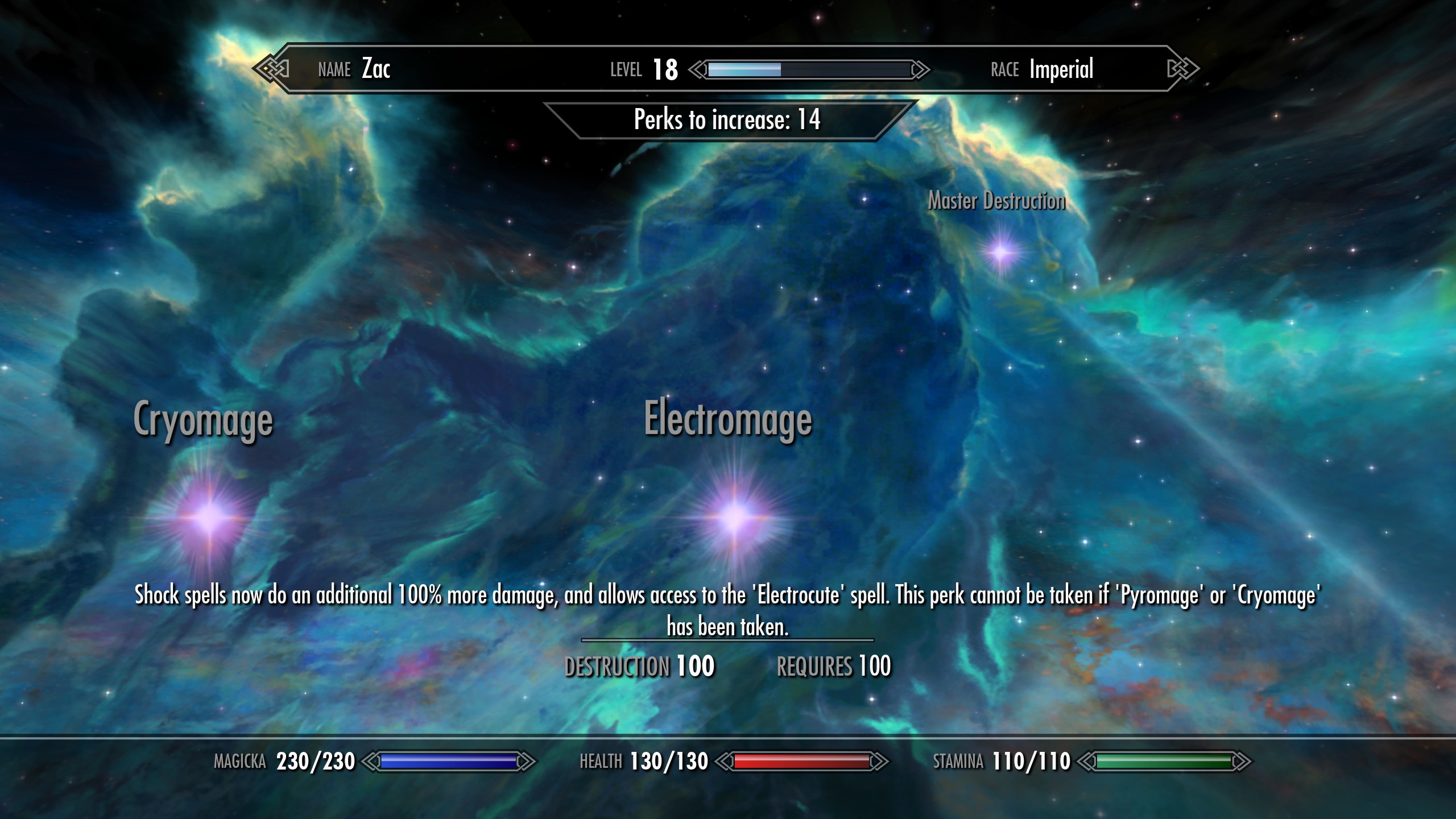 - Электромант - электрические заклинания наносят на 100% больше урона, и становится возможным использование заклинания "Смертельный разряд". Этот навык не может быть взять, если вы взяли "Пиромант" или "Криомант".