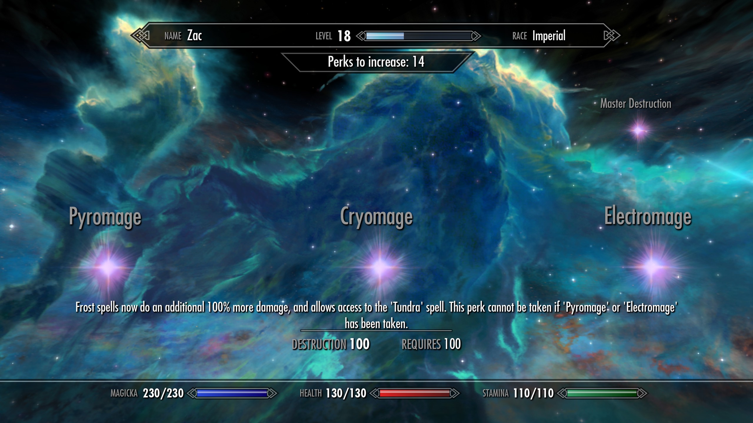 - Криомант - морозные заклинания наносят на 100% больше урона, и становится возможным использование заклинания "Тундра". Этот навык не может быть взять, если вы взяли "Пиромант" или "Электромант".