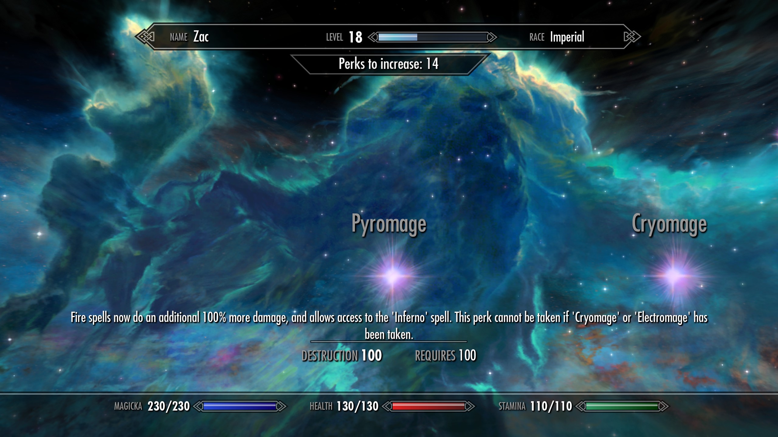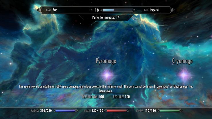 - Пиромант - огненные заклинания наносят на 100% больше урона, и становится возможным использование заклинания "Инферно". Этот навык не может быть взять, если вы взяли "Криомант" или "Электромант".