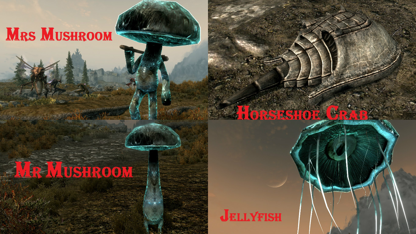 Существа: кавардак, нигри, Mrs гриб, Mr гриб, костяная гончая, спригган - матриарх , огненная королева, даэдра - великан, проклятая кукла, дух плоти, пепельный зомби, пепельный голем, пепельный хунч, пепельный гуль, пепельный прыгун, пепельный пожиратель, медуза, огненный шторм, мисси - спригган, галлимим, лорд - кавардак, скорпион, минотавр, вознесенный мастер, железный паук, костяной лупер, костяной шторм каирна душ, костяной дух тролля, костяной лорд, бентический черт, бентическая гончая, бентический шаман, никс гончая, бронированная гончая, бронированный фалмер - разведчик, бронированный волк, бронированный фалмер - воин, бронированный фалмер - мастер, бронированный саблезуб, бронированный драугр - воин, бронированный драугр - великан, бронированный драугр - повелитель, магическая метла, краб - меченосец, тролль - мутант, тролль - жрец, тролль - вожак, гомо тролль, трицератопс, ледяной рыцарь и т. д.