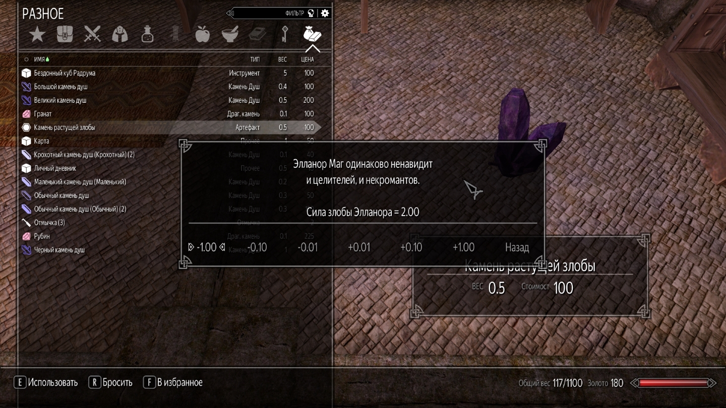 Зачарование "Растущая злоба", снимаемое с кинжала, изначально наносит 0 единиц урона всем атрибутам, но с каждым убийством его сила растёт. Дополнительный урон будет одинаков для любого оружия, на которое вы наложите эти чары, и все это оружие будет "работать" на трех демонов, заключенных в особом камне. При помощи камня вы сможете настроить коэффициенты роста урона отдельно для каждого атрибута. Чтобы не было вопросов о балансе/читерности зачарования, вы можете установить значения 0.01, и тогда оружие будет отнимать 1 единицу здоровья/магии/выносливости до 100 убийств, 2 единицы до 200 убийств, 3 до 300 и т.д. Все в ваших руках. Кроме того, для оружия с этими чарами можно активировать эффект захвата душ - при помощи всё того же "камня растущей злобы".