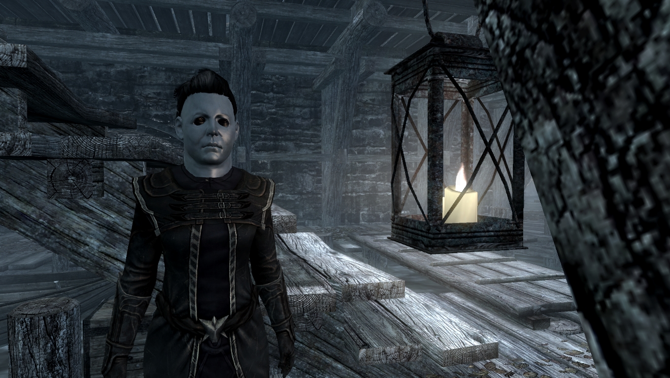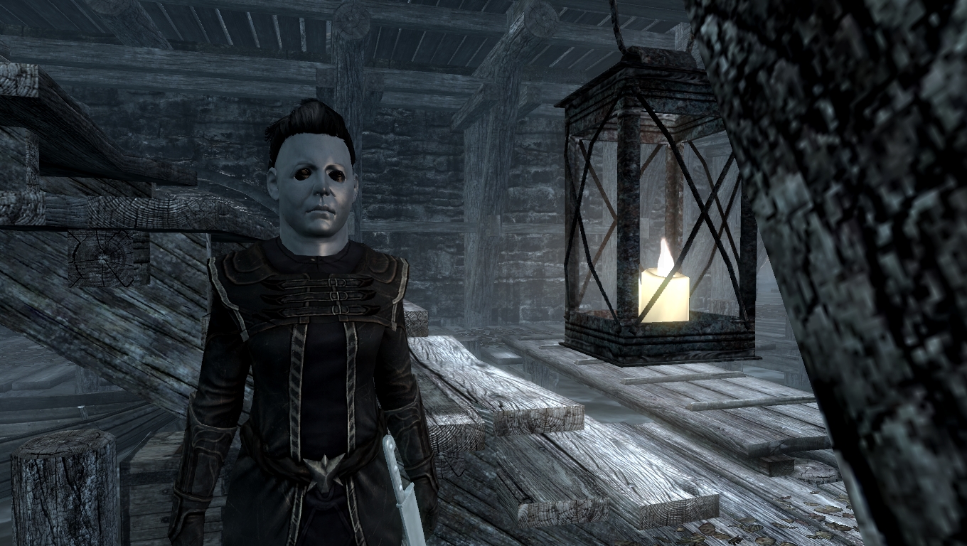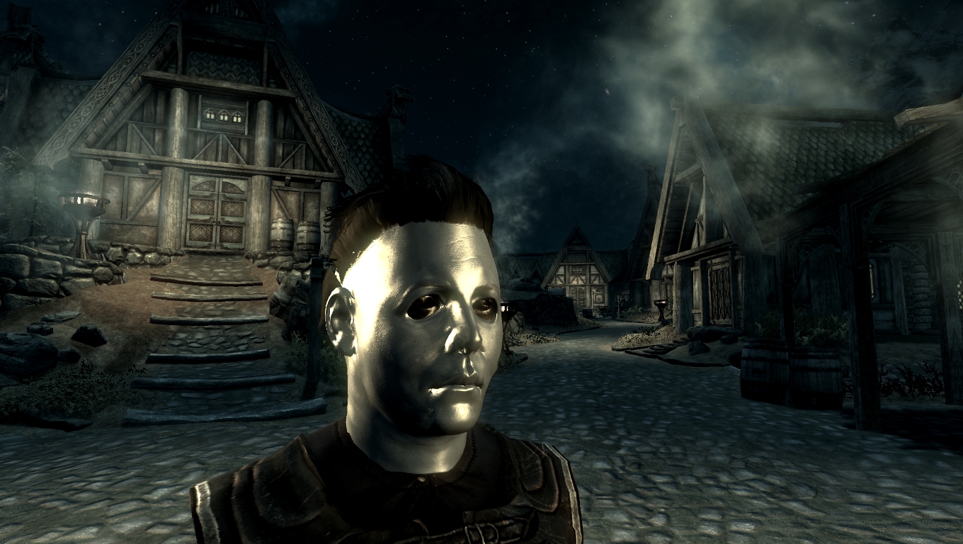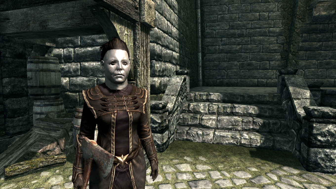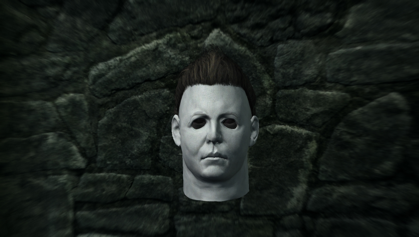 Ищите сундук с вещами Майкла Майерса в городе Рифтен (район каналов). Также маску можно получить с помощью программы AddItemMenu.
