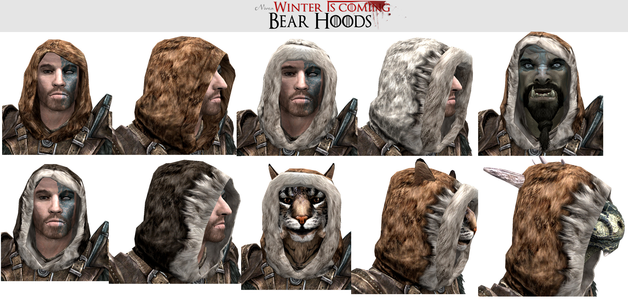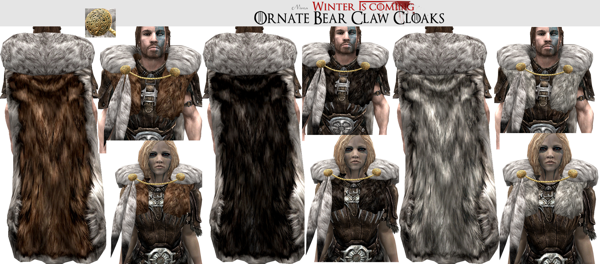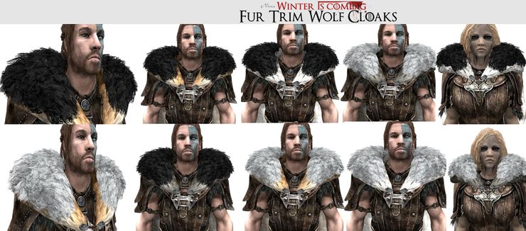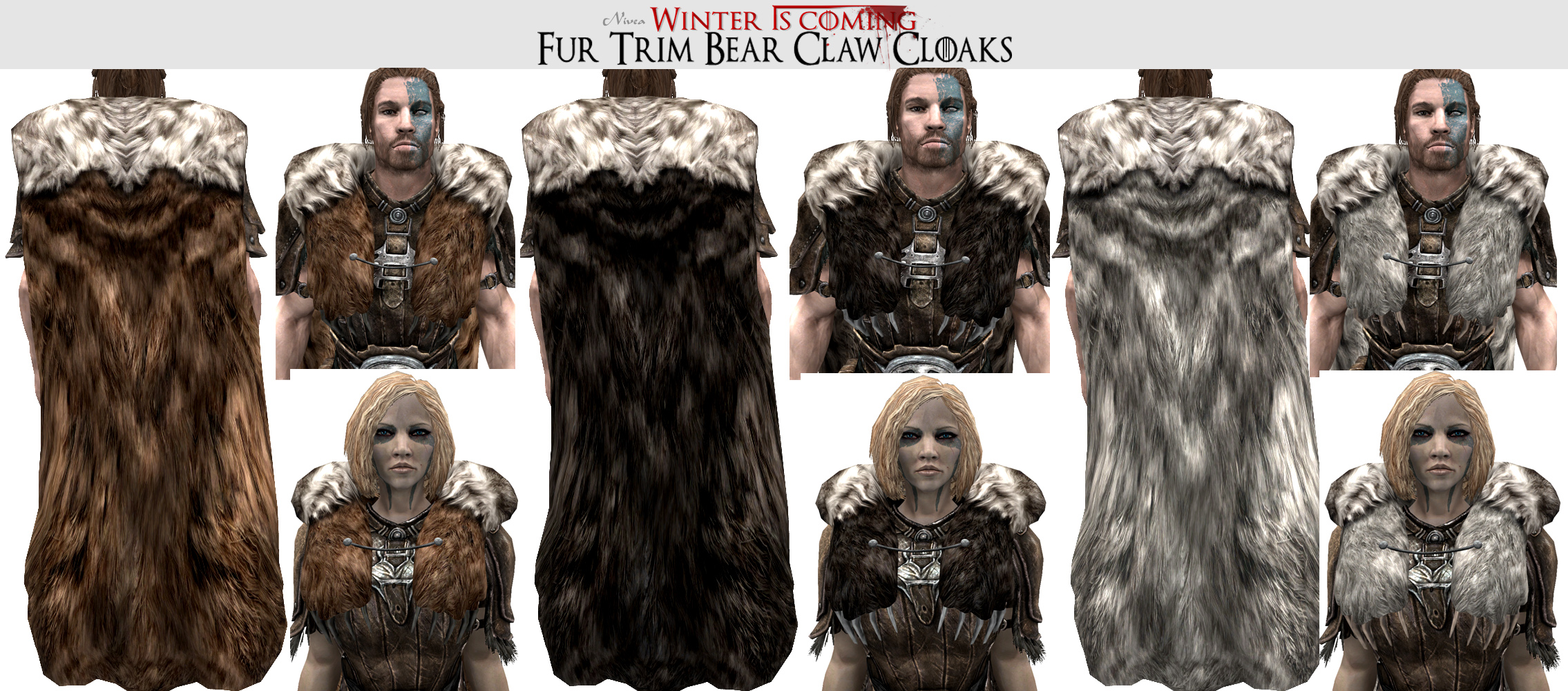 Этот замечательный мод добавляет в игру меховые плащи и капюшоны, гораздо больше приличествующие местной погоде. Тяжелые пышные одеяния пошиты из шкур разных медведей и волков, а некоторые из них украшены когтями. Разнообразия добавляет отделка и опушка.