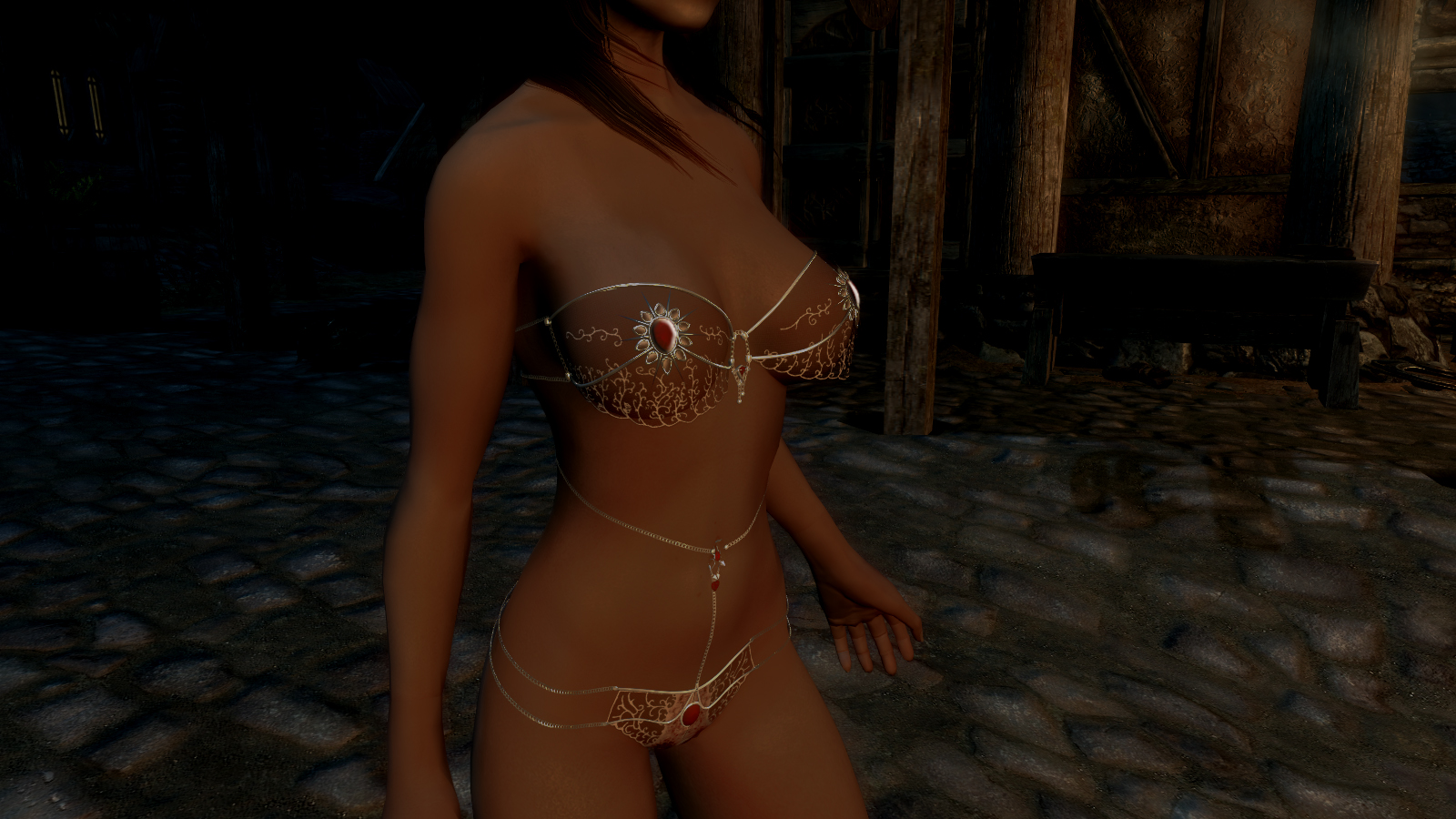 В комплекте двухцветовое бикини (одежда), туфли и браслеты. Идём в кузницу и в драгоценном разделе куём.