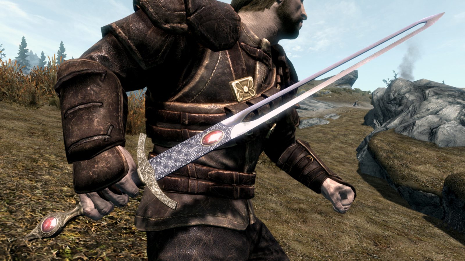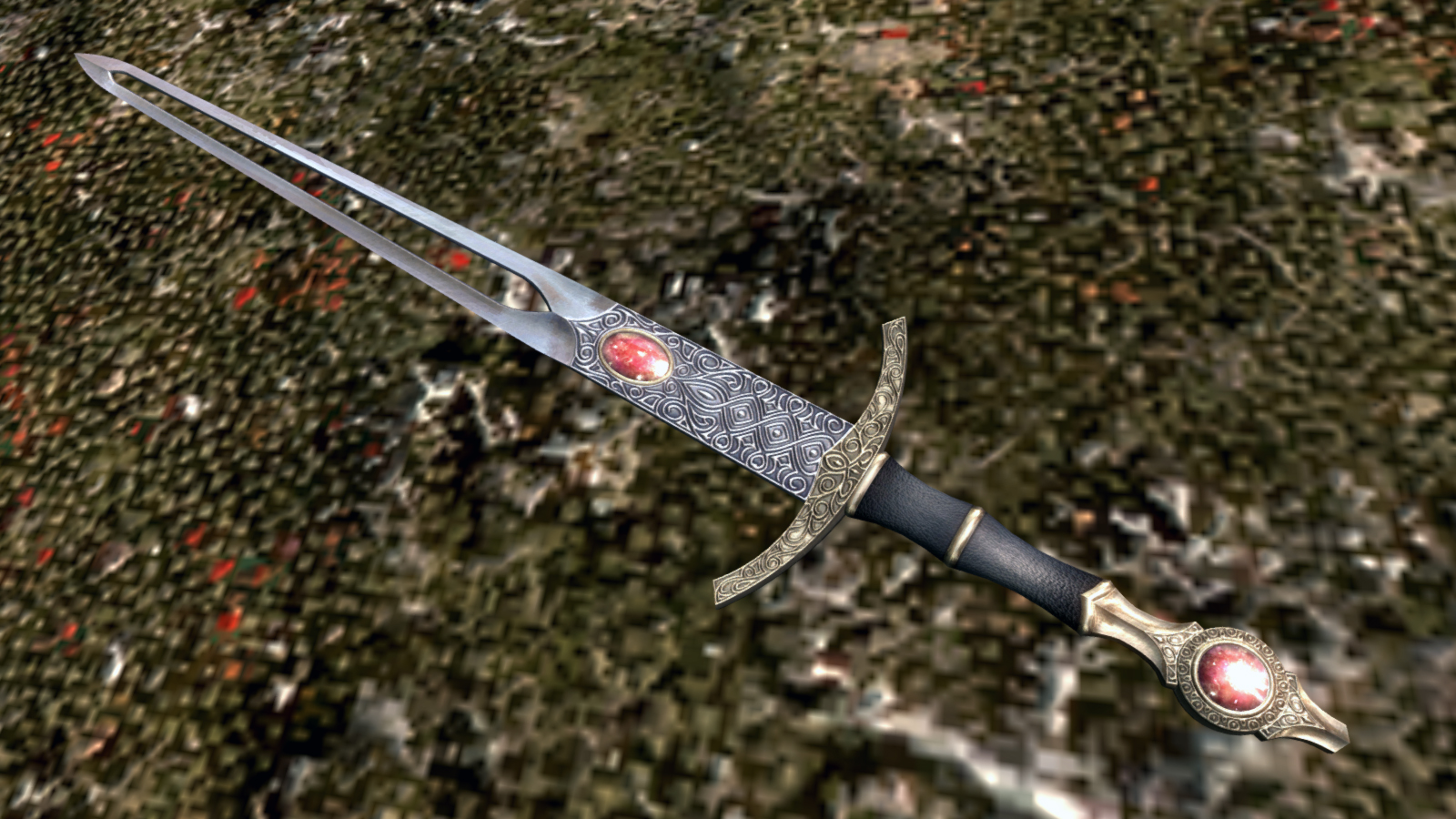 Эта модификация добавляет в игру меч из игры Gothic 3 - Рубиновый Клинок. Найти его можно в локации Лагерь Говорящий Камень, что к северо-востоку от Рорикстеда. Более подробное местоположение отмечено на скриншоте.