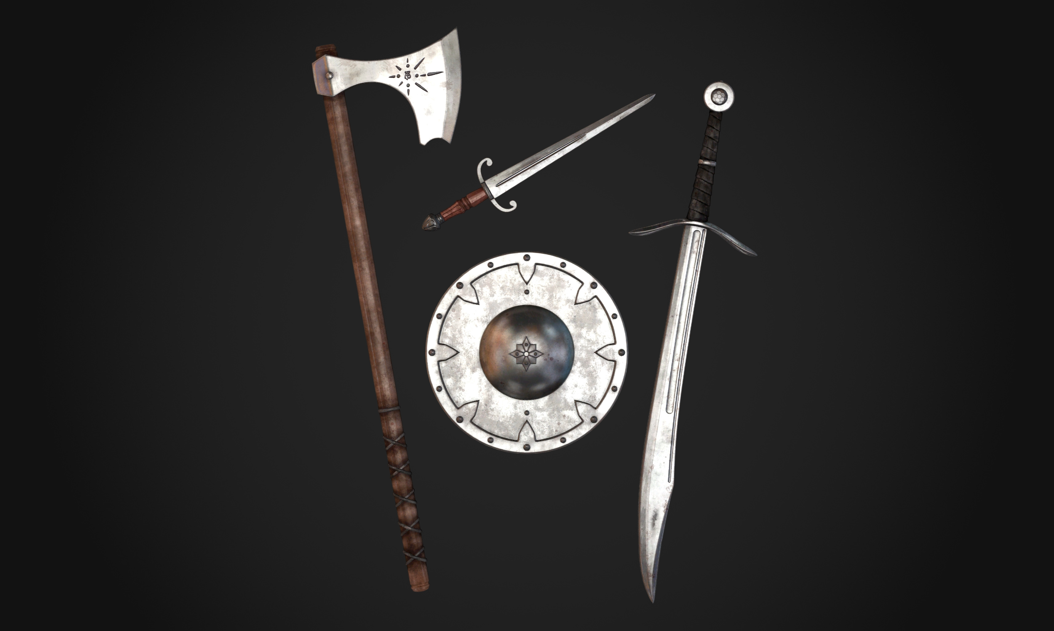 Baltimore Knife and Swords, состоящий из фальшиона (одноручного и двуручного), двух вариантов кинжалов (короткого и длинного), боевого топора, секиры и большого и маленького баклеров.