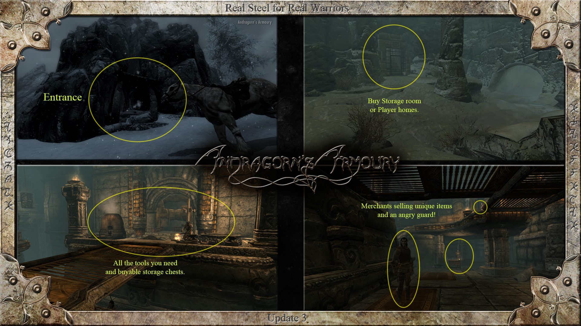 Низкоуровневое хранилище с 6 контейнерами, 1 манекеном, 7 оружейными стойками, 5 стендов для оружия и 5 стендов для щитов. Башня расположена рядом со входом.