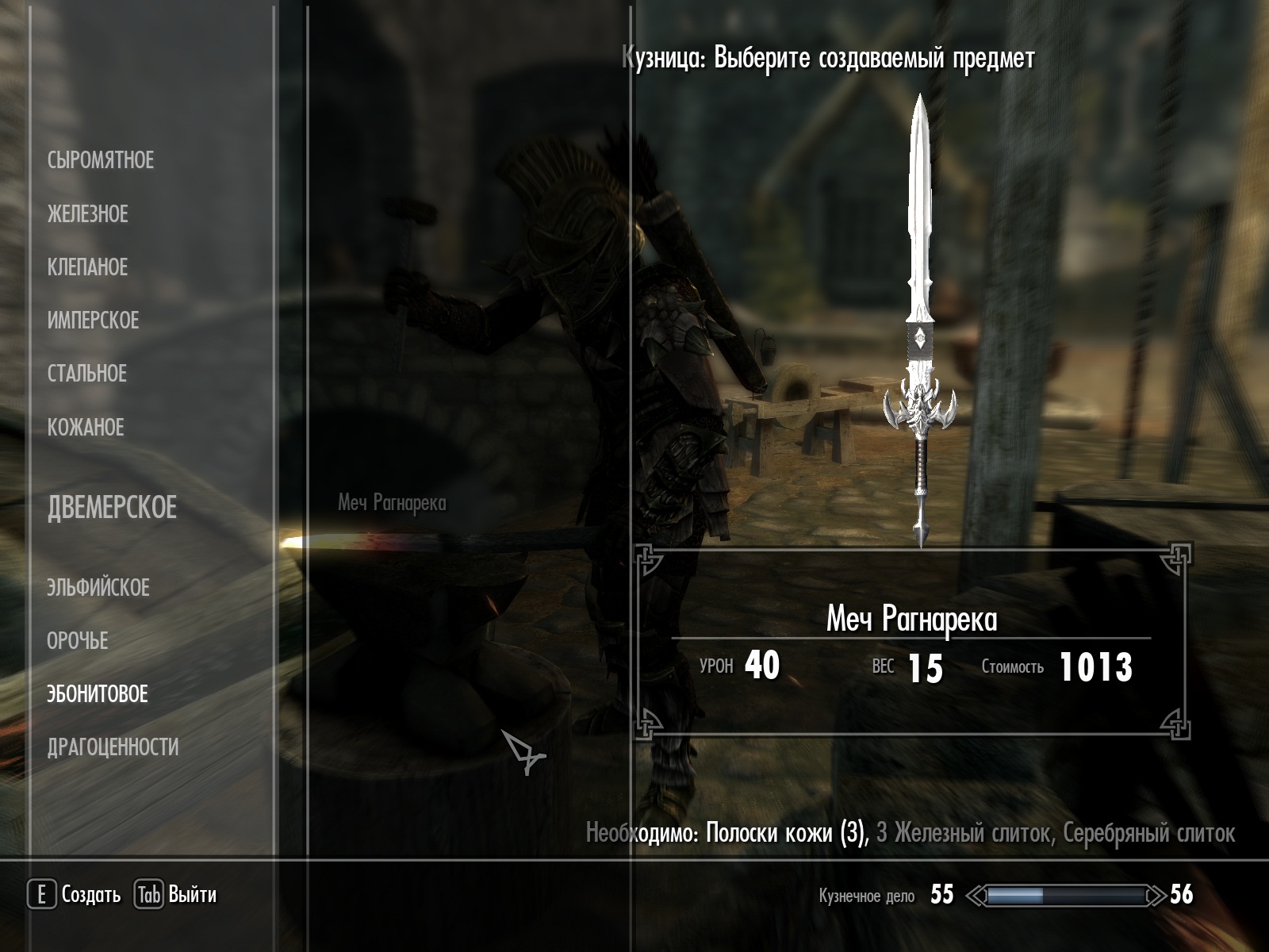 Мод добавляет в игру мощный одноручный меч Рагнарека, последней битвы конца мира. Этот прекрасный клинок вы можете выковать сами в разделе эбонитового, вам понадобятся три полоски кожи, три железных слитка и один серебряный. Зачаровывается.
