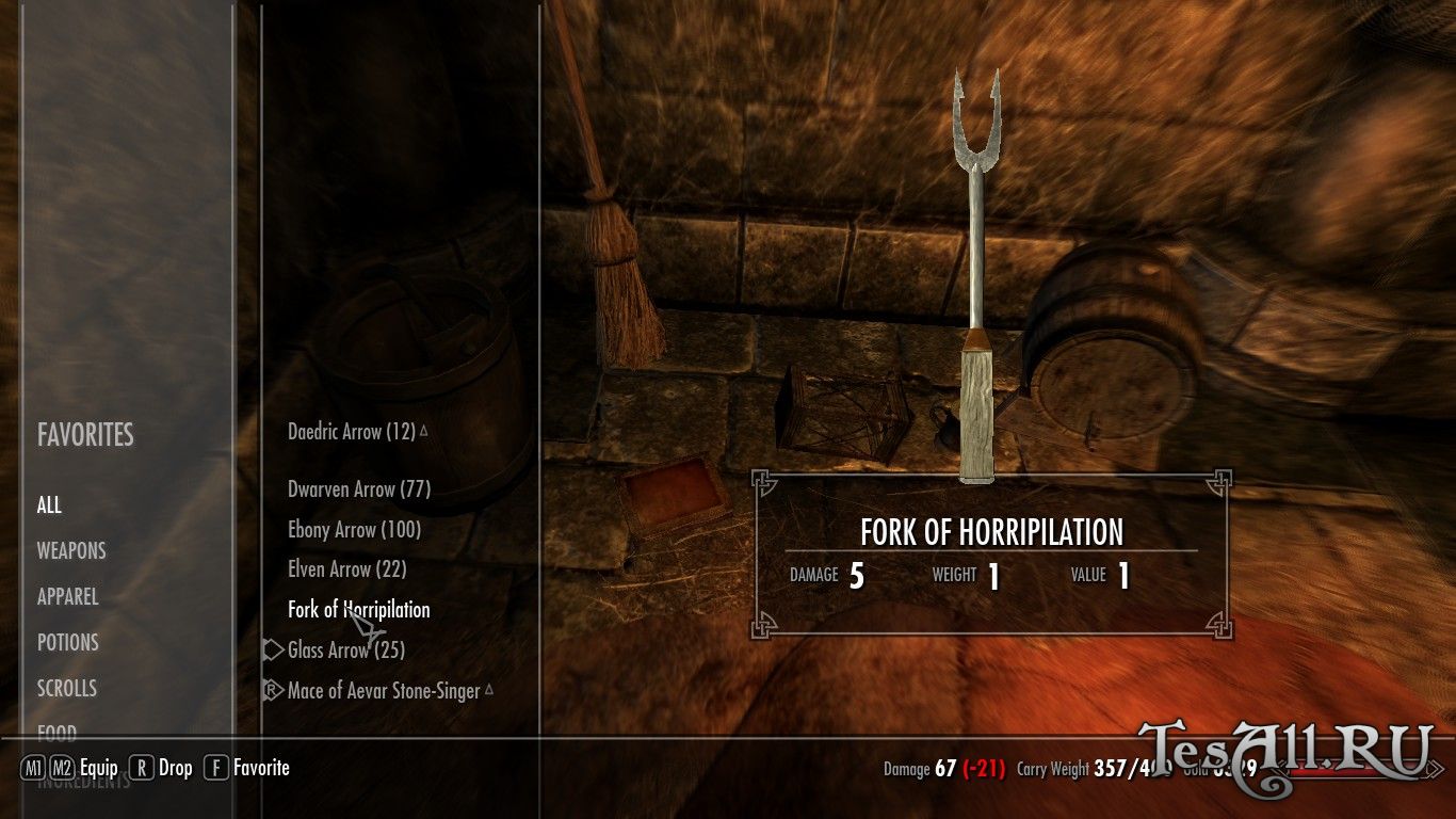 Артефакт Шеогората, который вы могли видеть в Морровинде и на Дрожащих Островах, теперь и в Скайриме! Как и в предыдущих частях, вилка абсолютно бесполезная. У нее очень низкий урон, к тому же, при экипировке она добавляет владельцу проклятие Шеогората. В основном, мод предназначен для тех, кто любит коллекционировать морровиндские артефакты. Автор разрешил использовать предмет в своих модах.