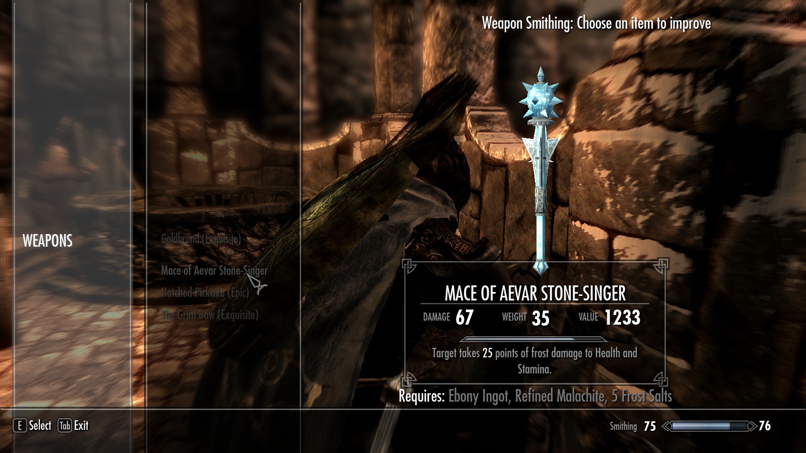 Одно из самых сильных оружий в Морровинде, теперь есть и в Скайриме! По характеристикам оружие соответствует Морровиндскому: очень тяжелое, медленное, но урон больше, чем у любой другой булавы.