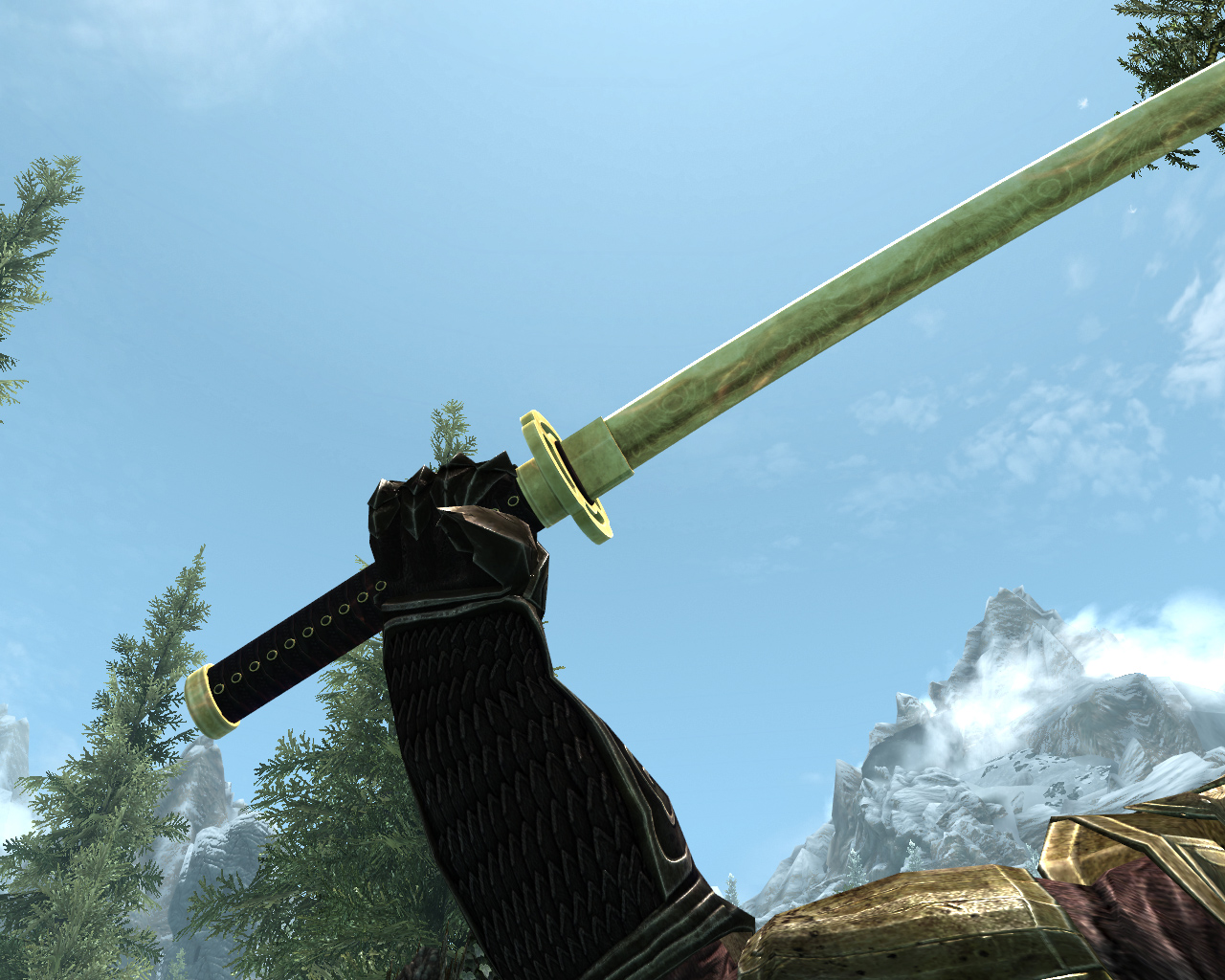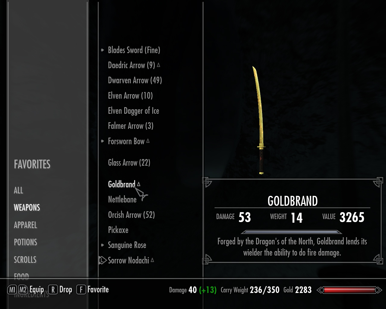 "Этот меч окутан плотной завесой тайны. Воры рассказывают истории о том, что сделан он из золота, и откован древними Драконами Севера. История гласит, что он был дан великому рыцарю, который присягнул защищать драконов. Этот меч дает владельцу способность поражать врагов огнем. В новой истории упоминаний о появлении этого меча нет - видимо, он все еще ждет нового героя."